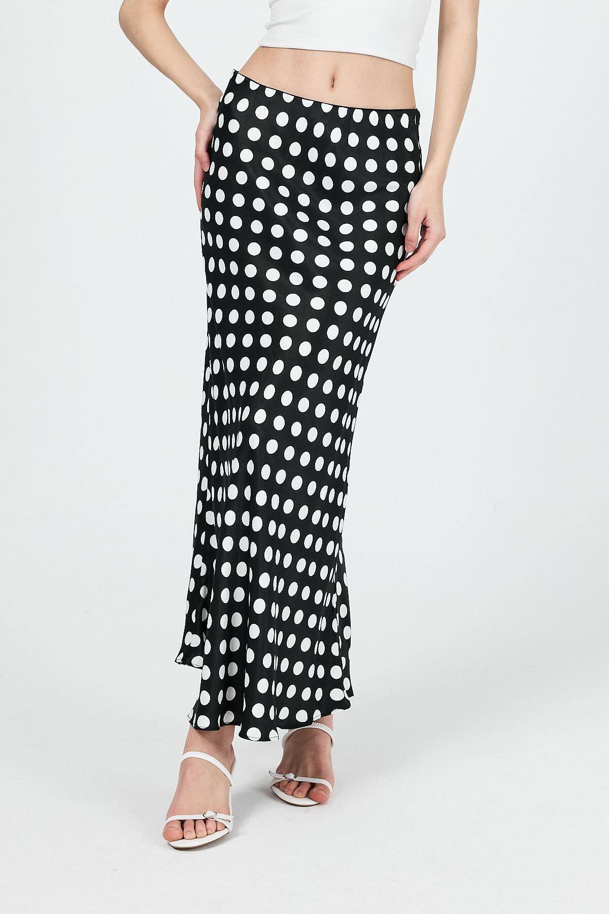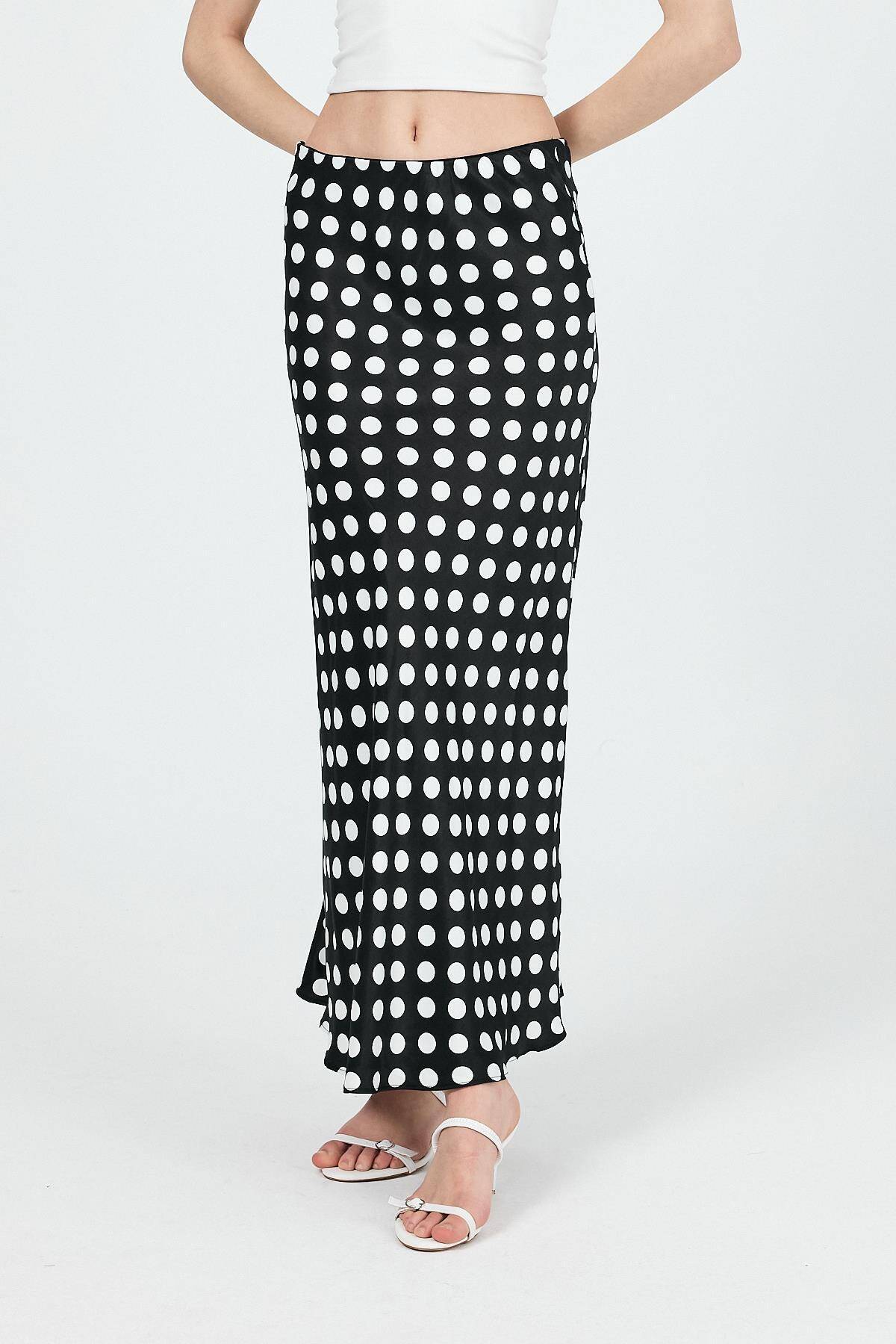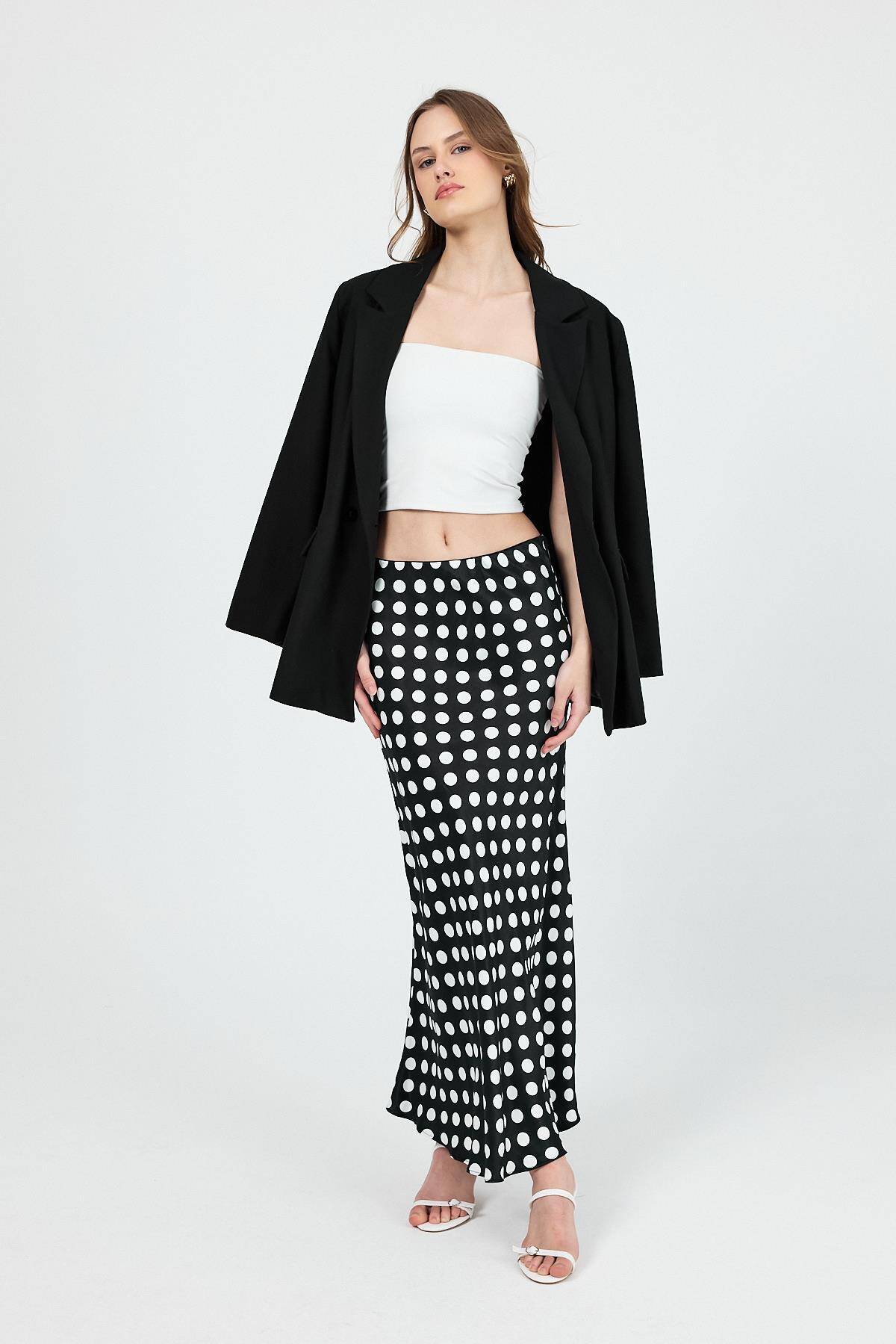 Siyah Puantiye Desen Saten Midi Etek 9416