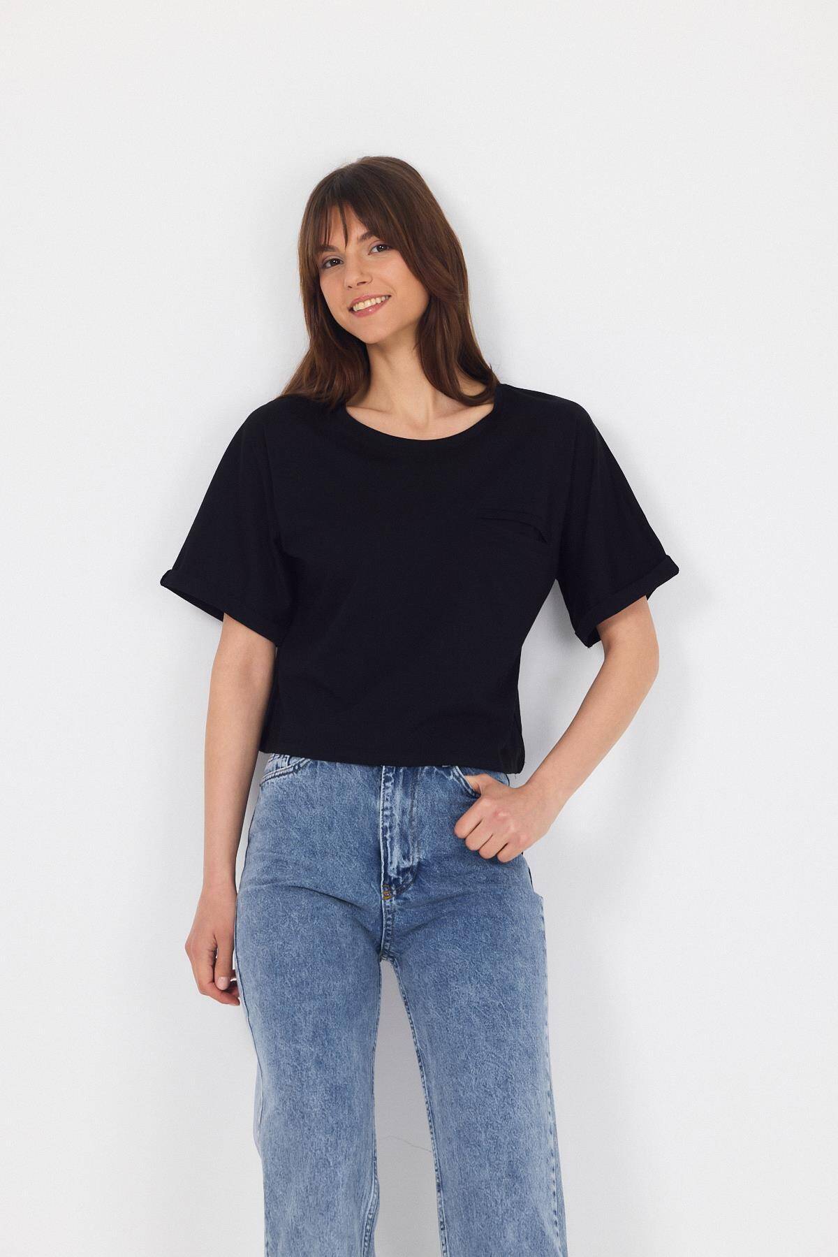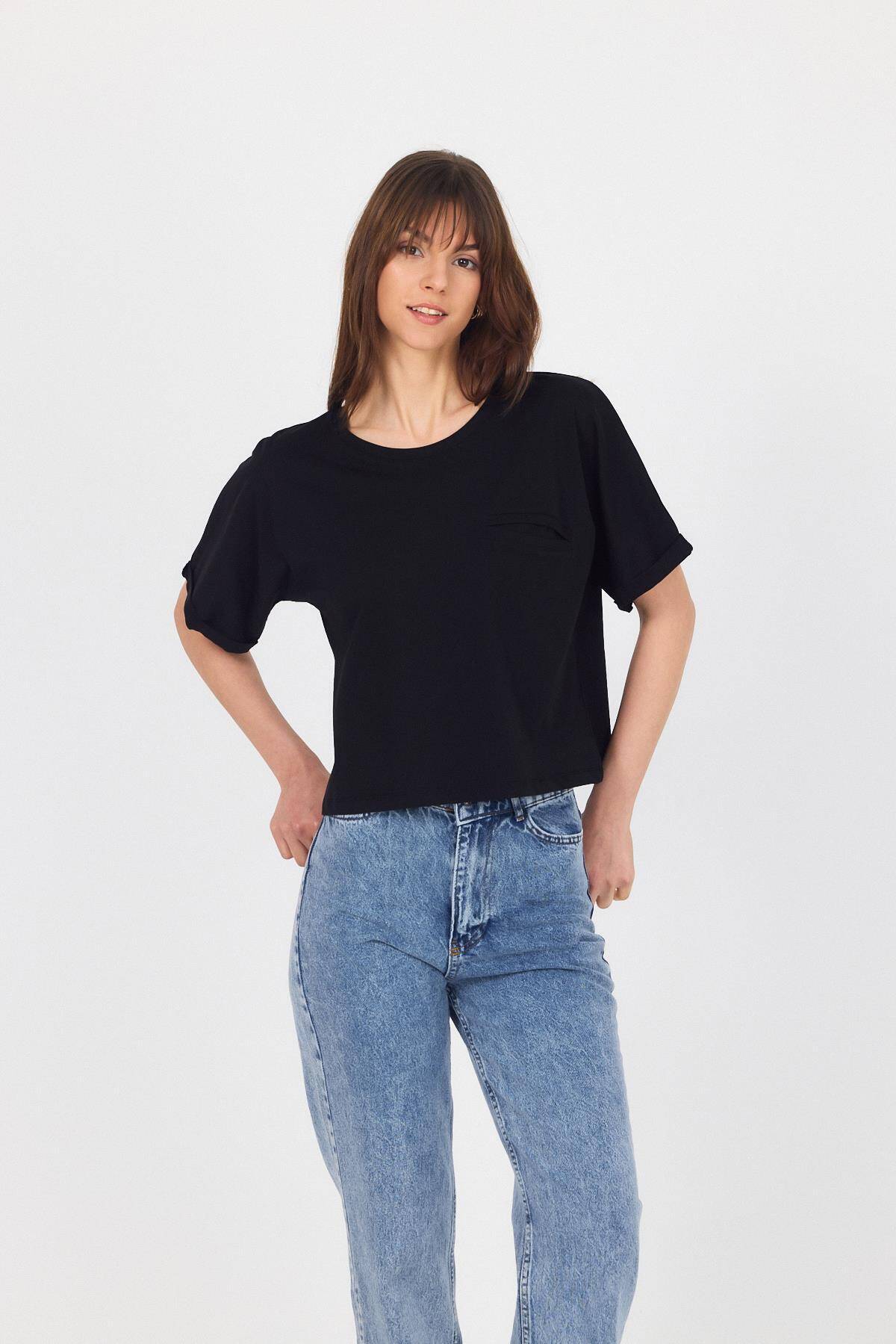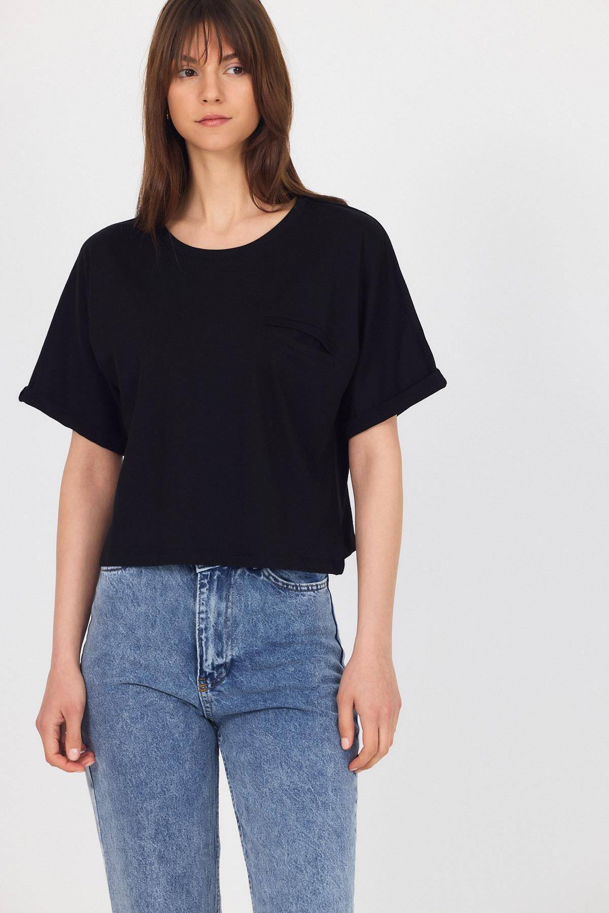 Siyah Sahte Cep Detaylı Bisiklet Yaka Crop Tişört 2136M