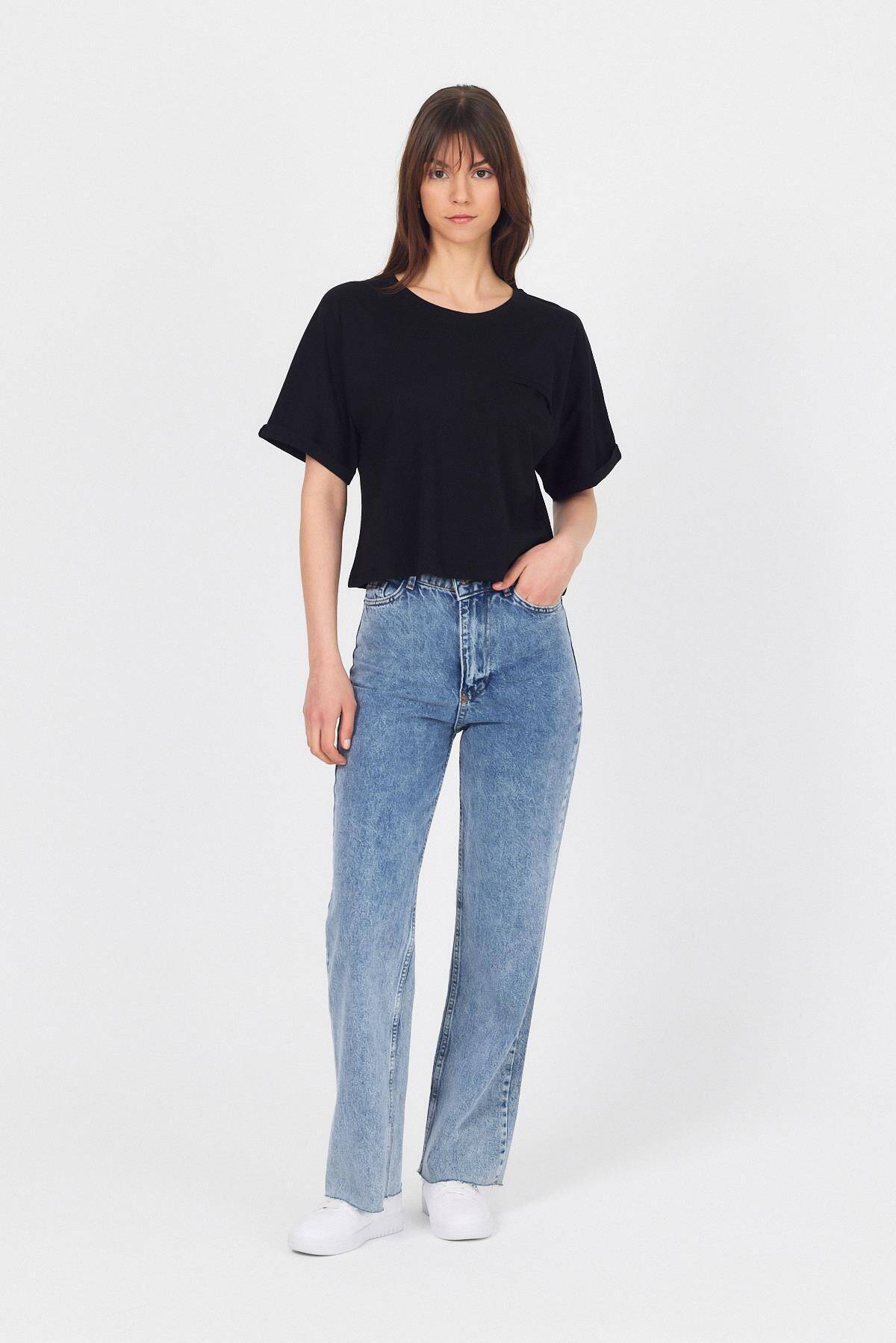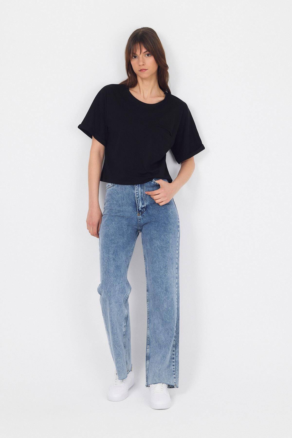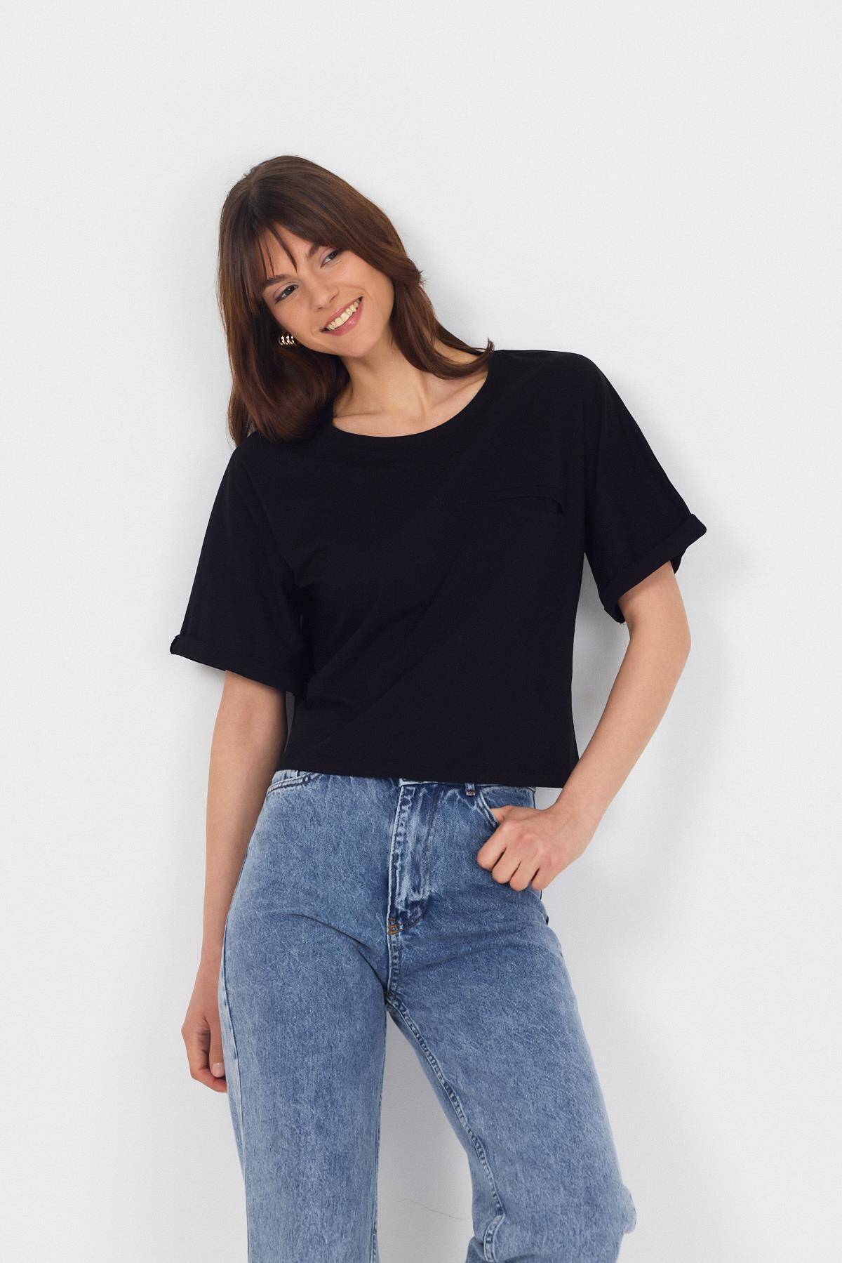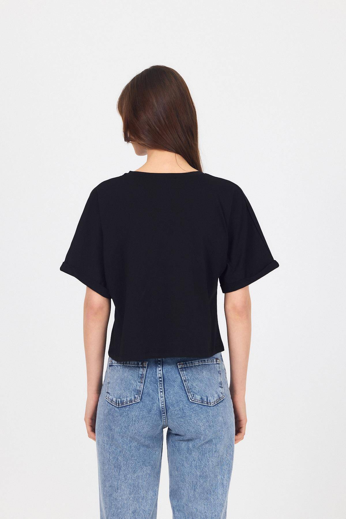 Siyah Sahte Cep Detaylı Bisiklet Yaka Crop Tişört 2136M