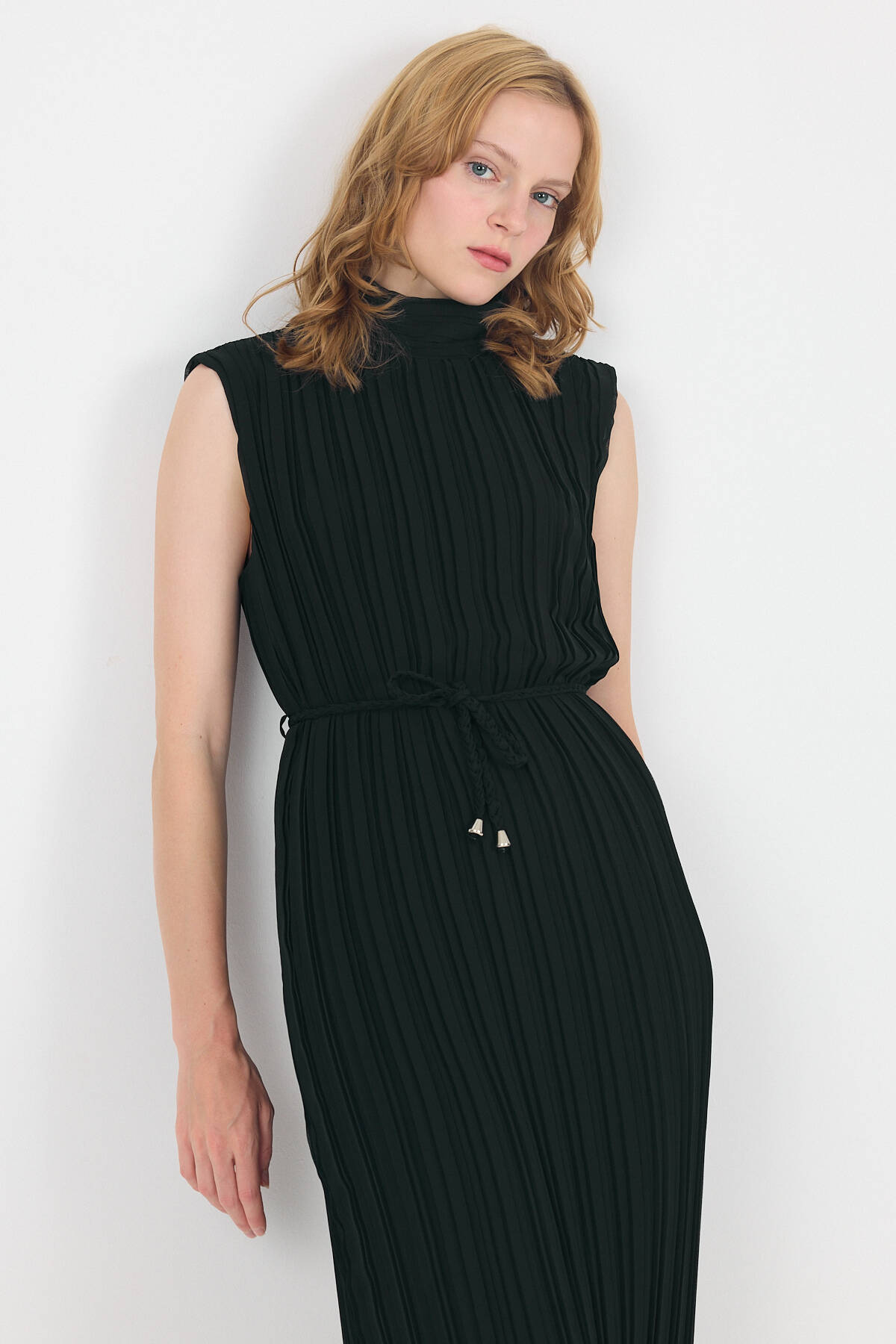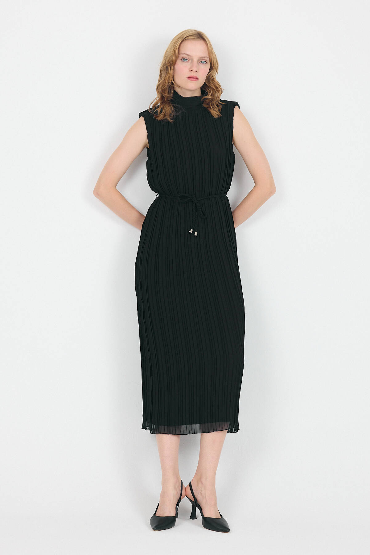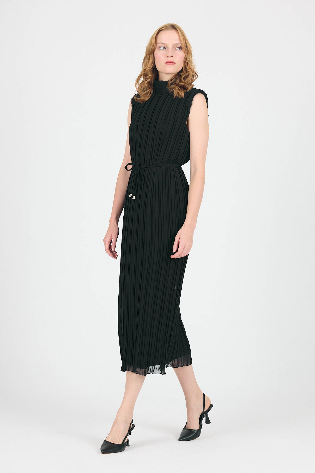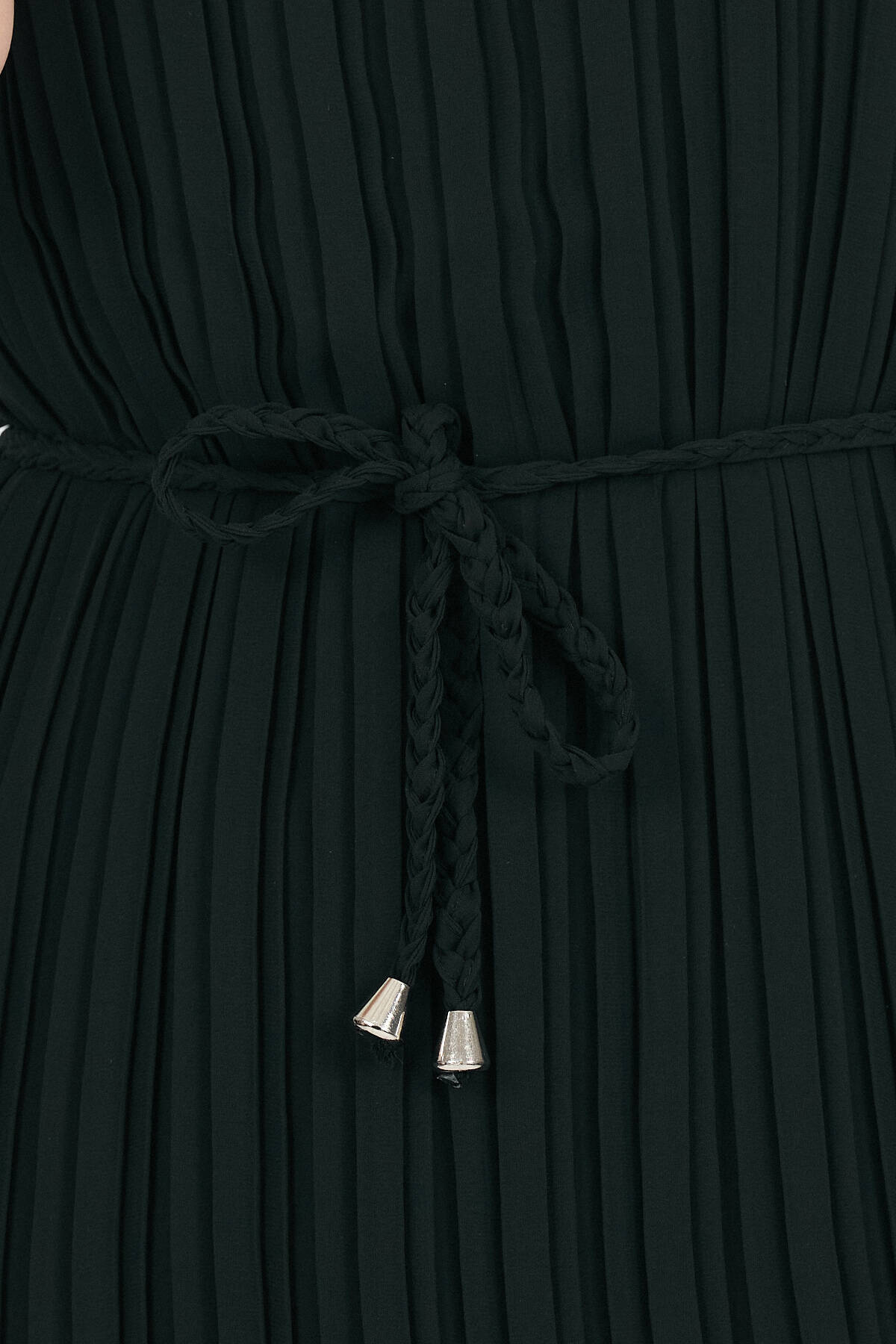 Siyah Şifon Kolsuz Pileli Bel Bağlamalı Midi Elbise 118