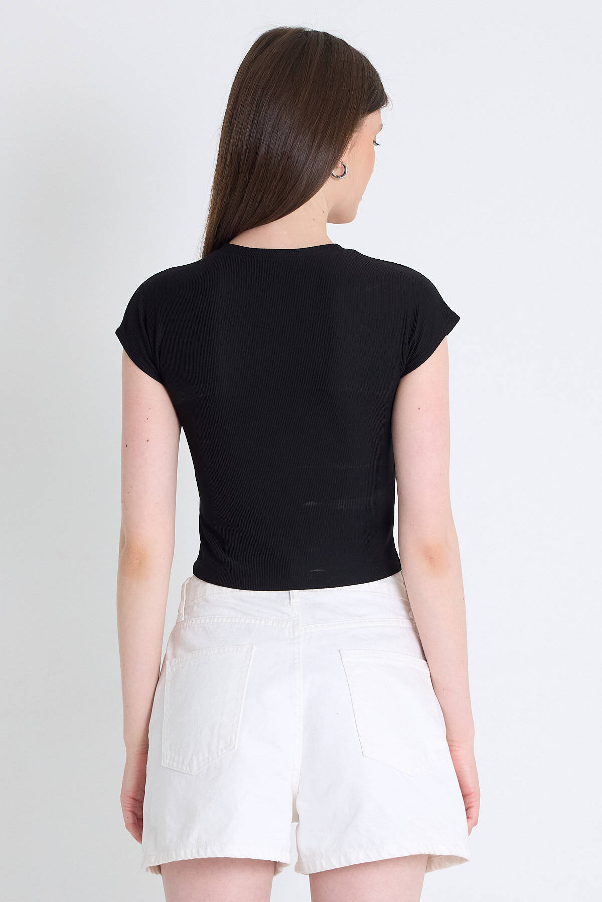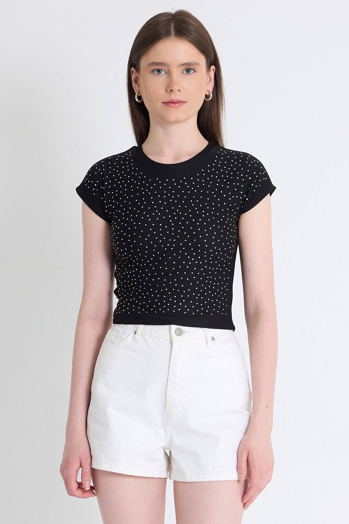 Siyah Taş Detaylı Slim Fit Crop Tişört 9207M