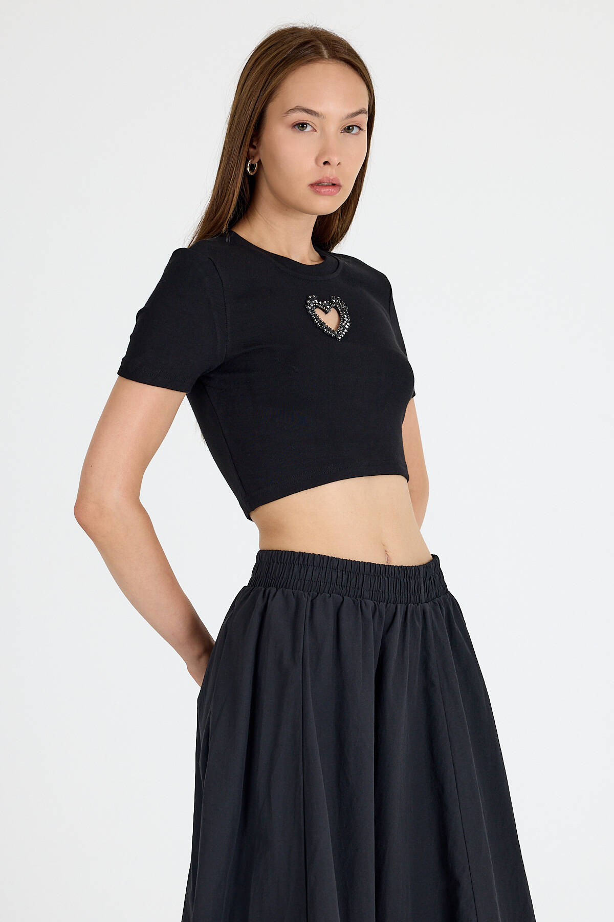 Siyah Taş İşlemeli Kalp Detaylı Viskoz/Yumuşak Kumaş Crop Tişört 2444