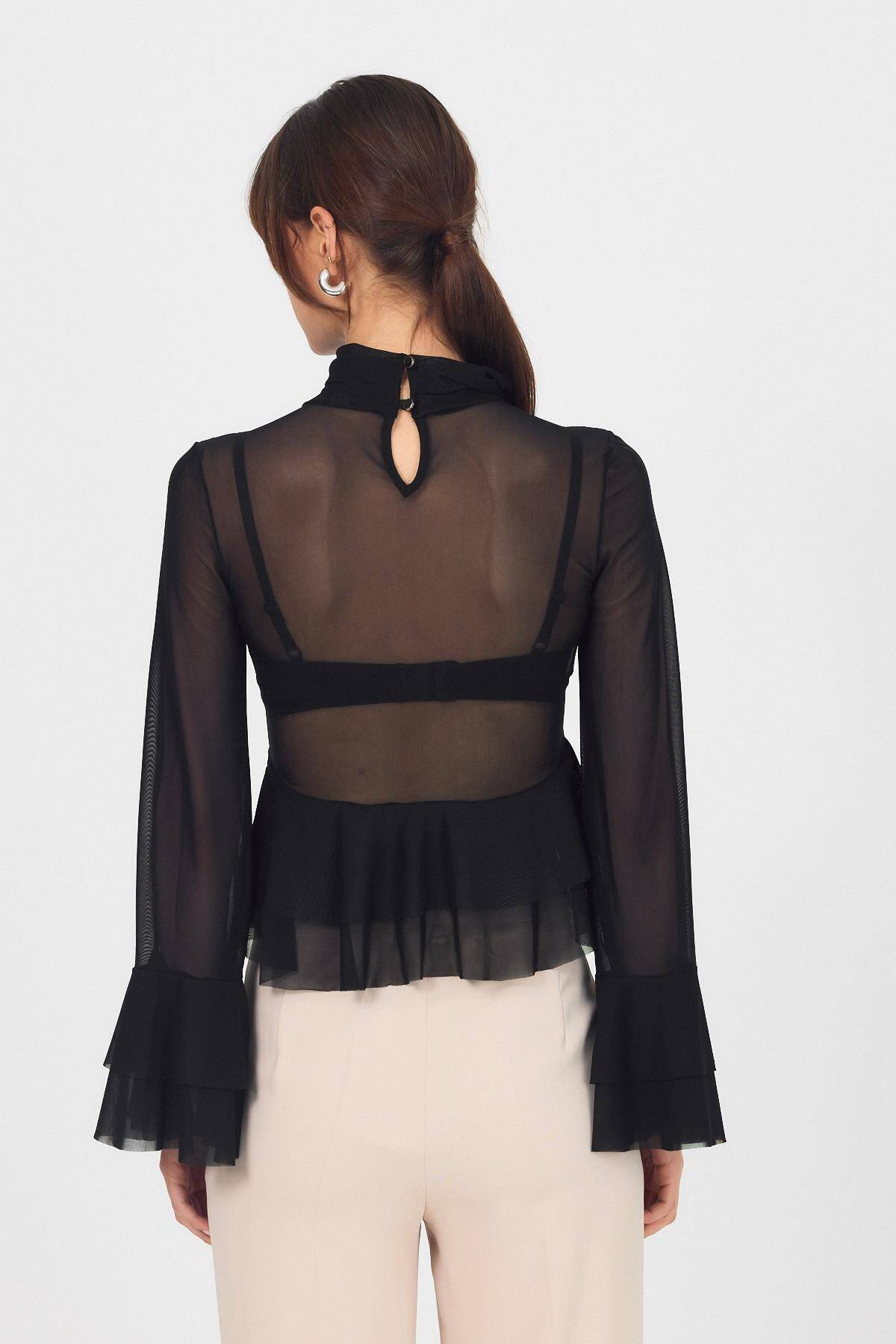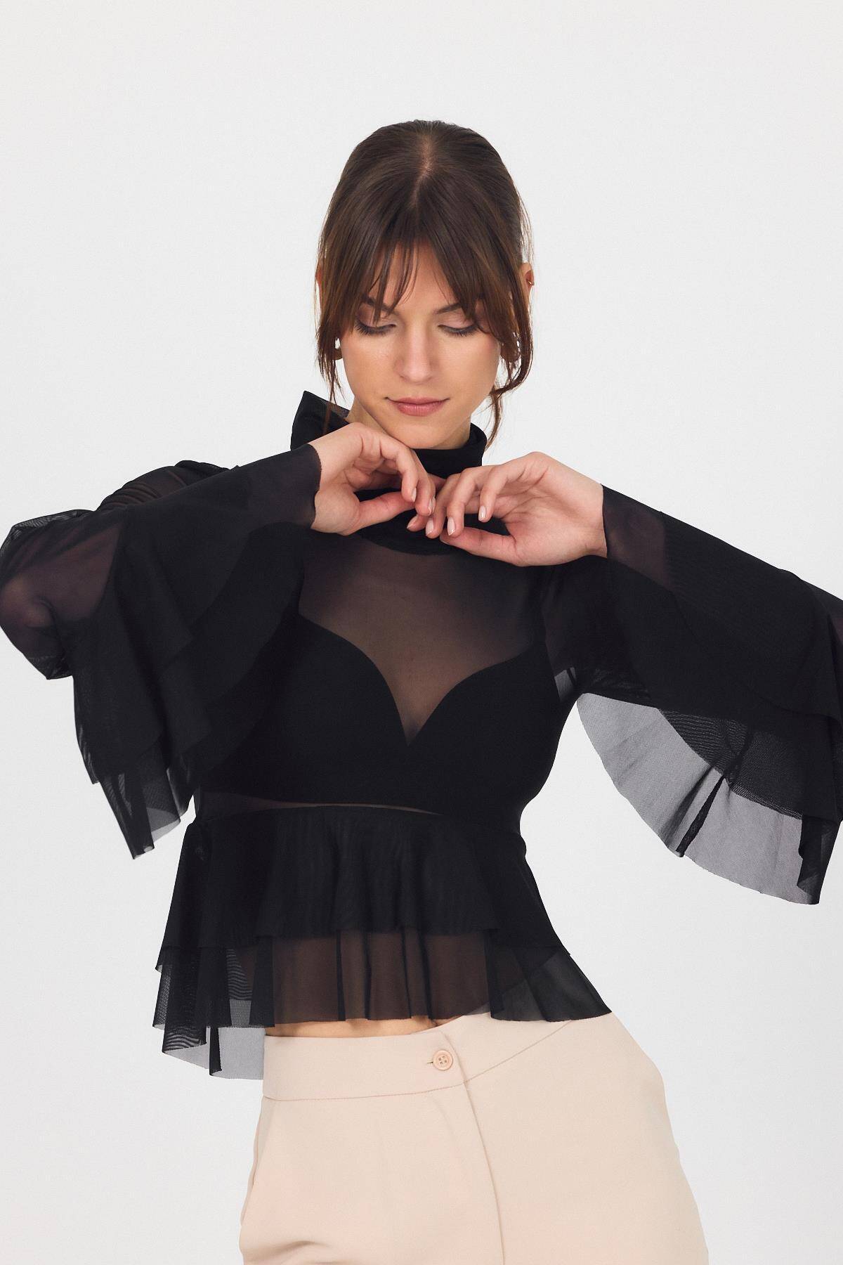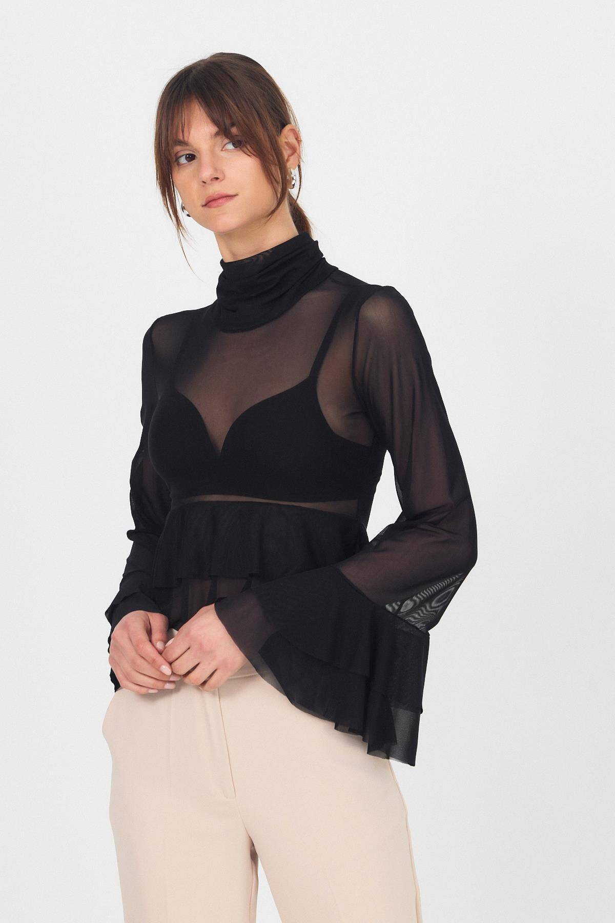 Siyah Transparan Volan Kollu Boğazlı Bluz 6836