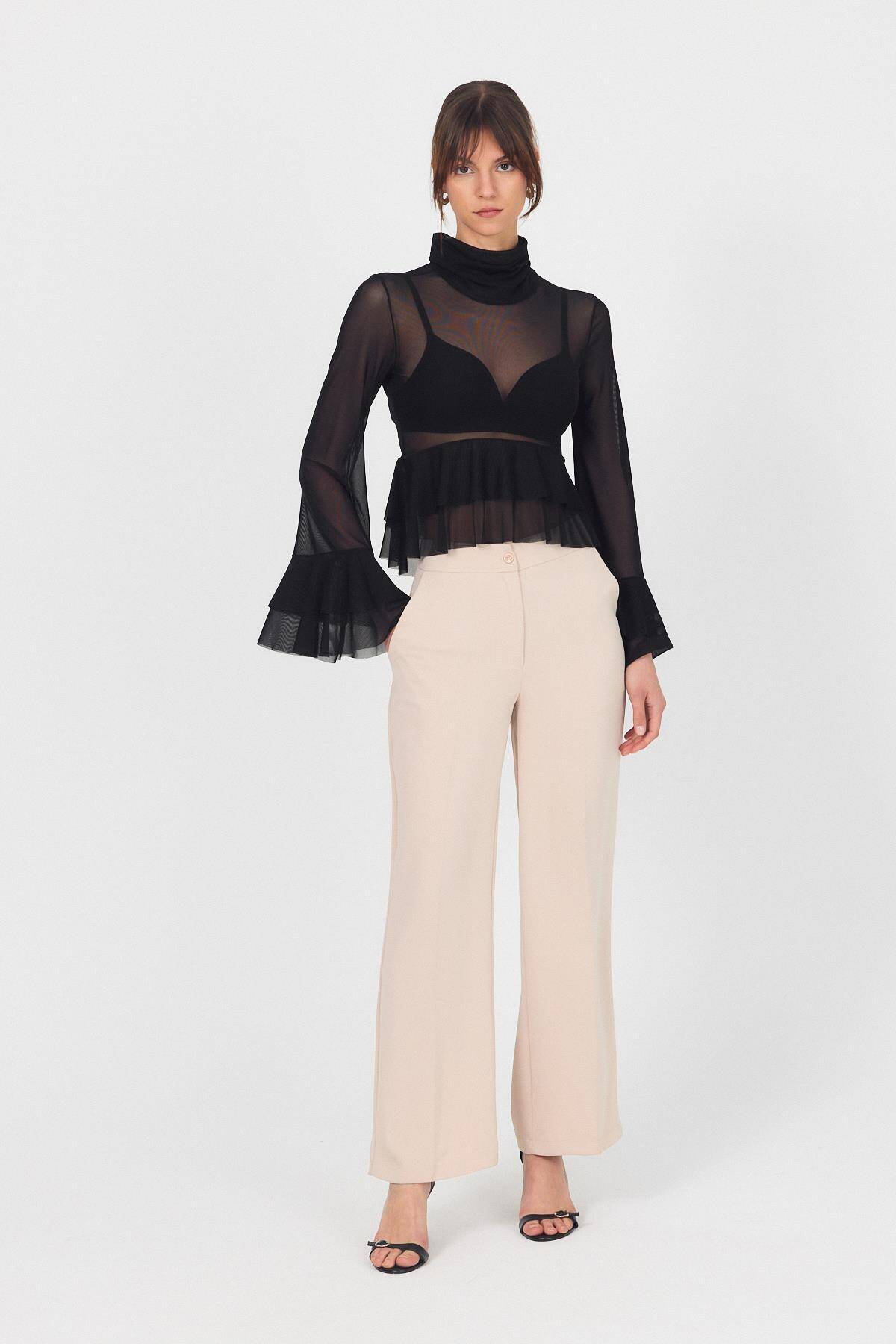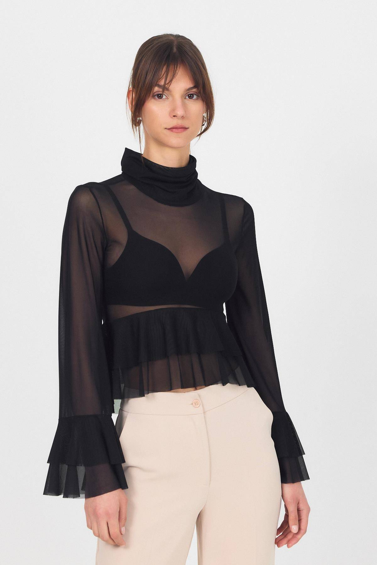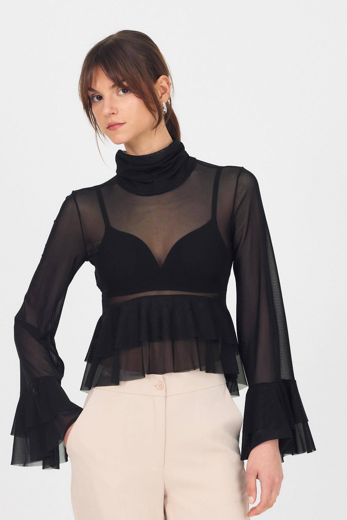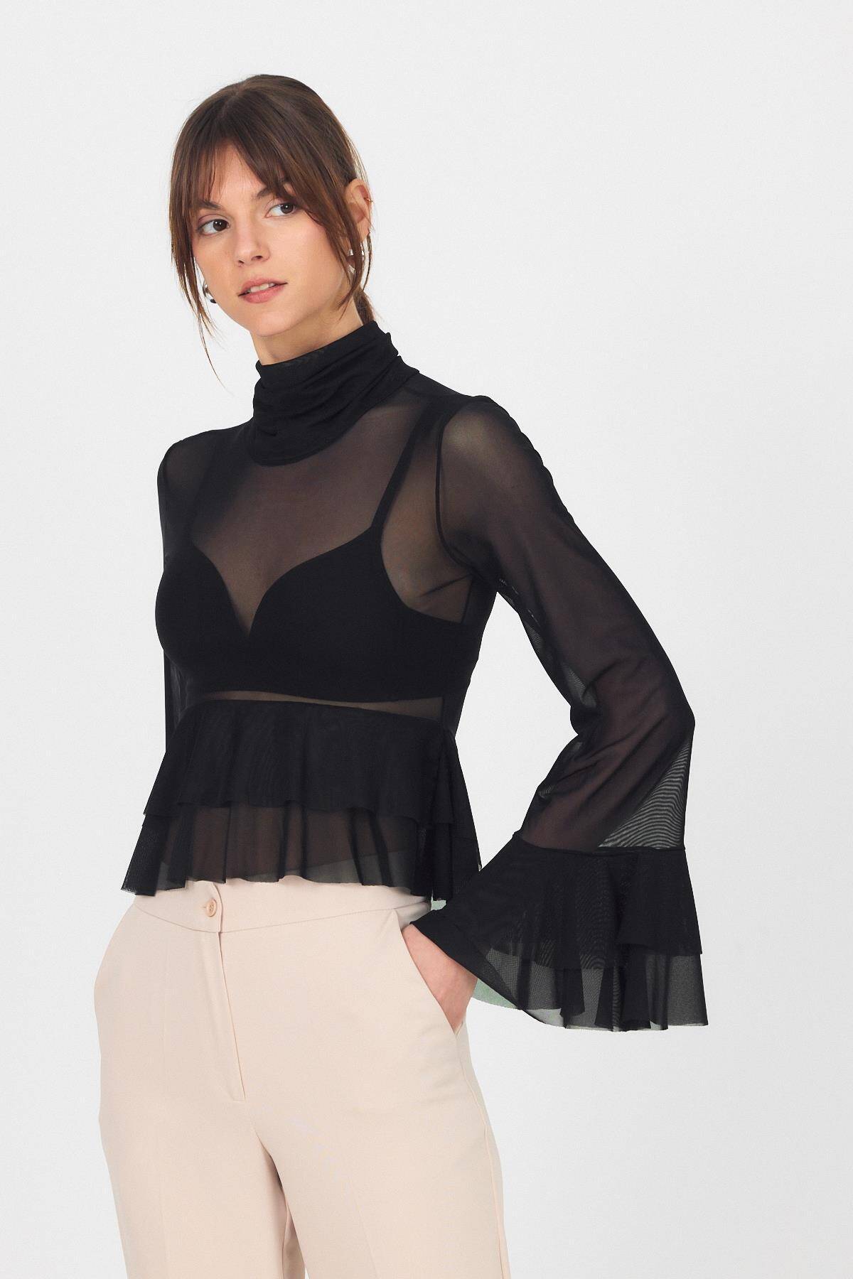 Siyah Transparan Volan Kollu Boğazlı Bluz 6836