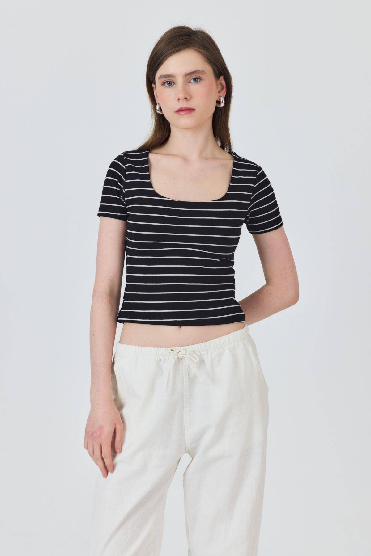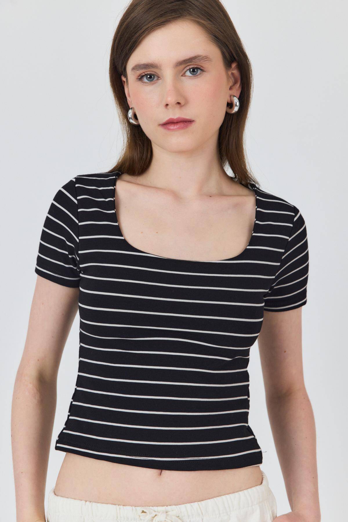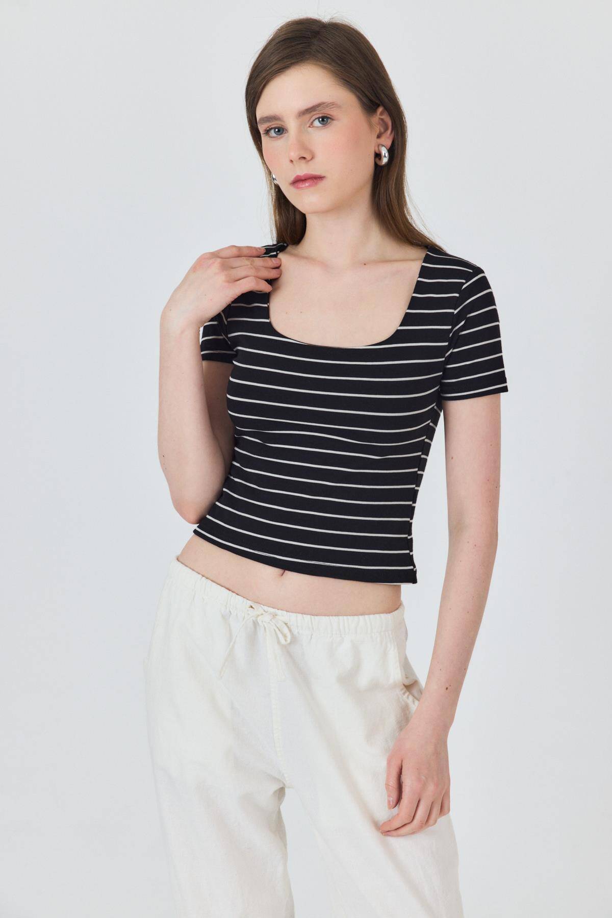 Siyah U Yaka Çizgili Tişört 4016