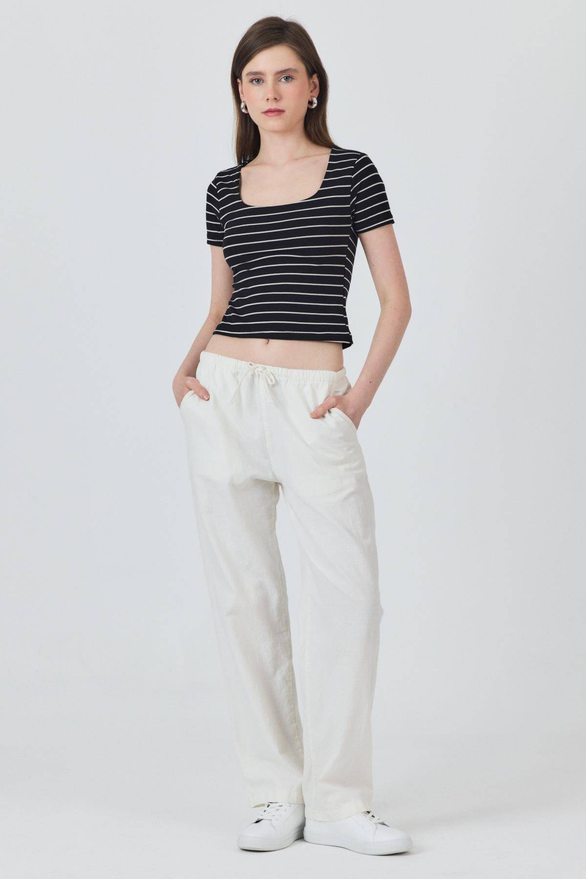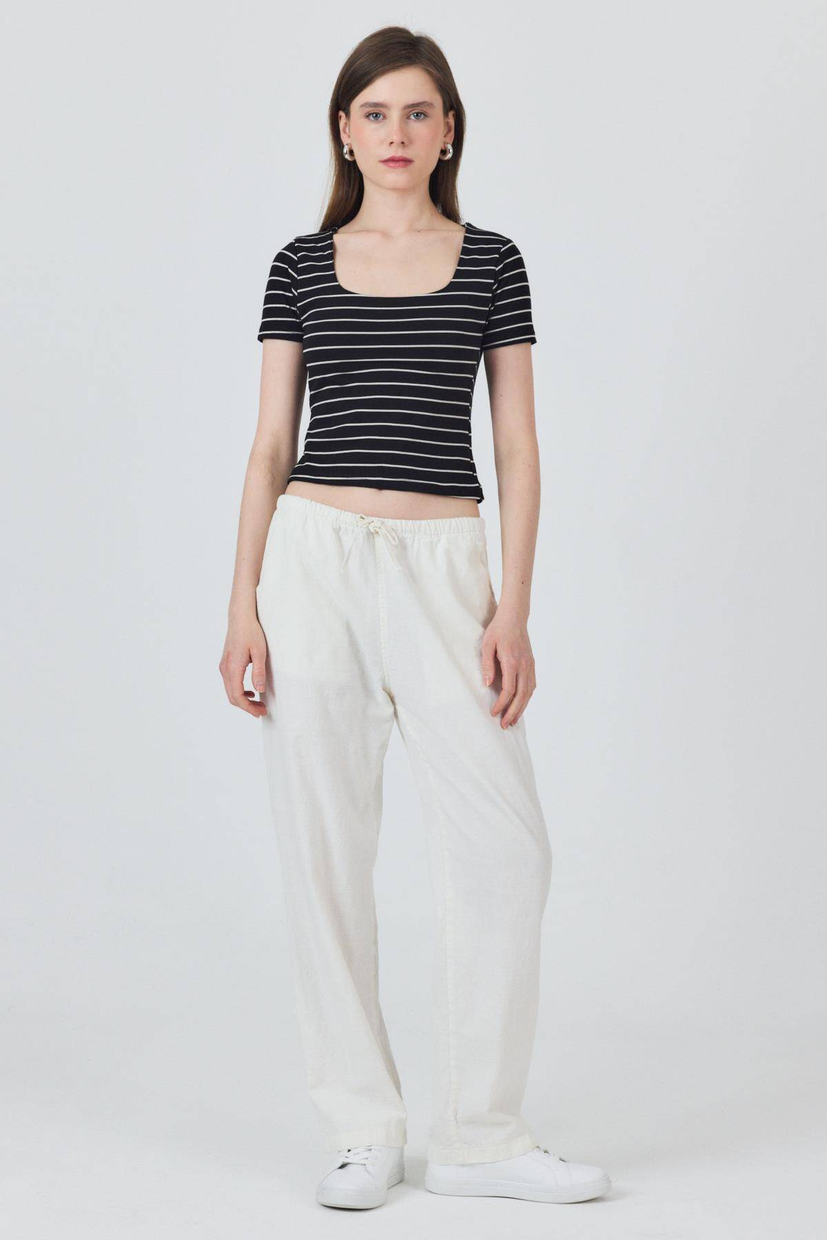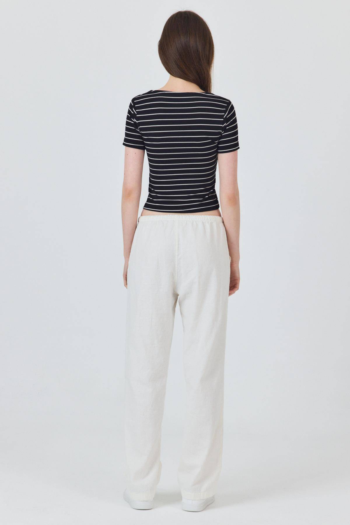 Siyah U Yaka Çizgili Tişört 4016