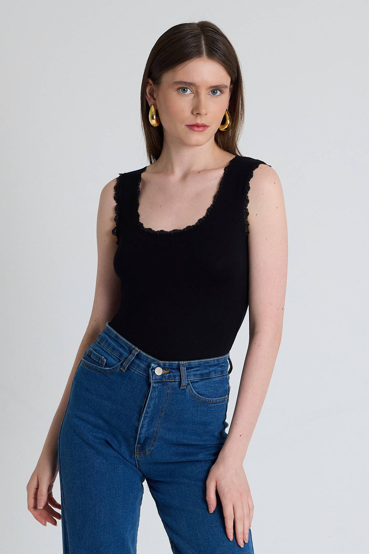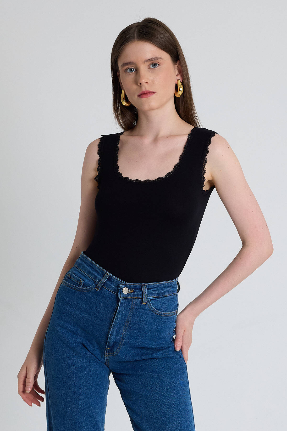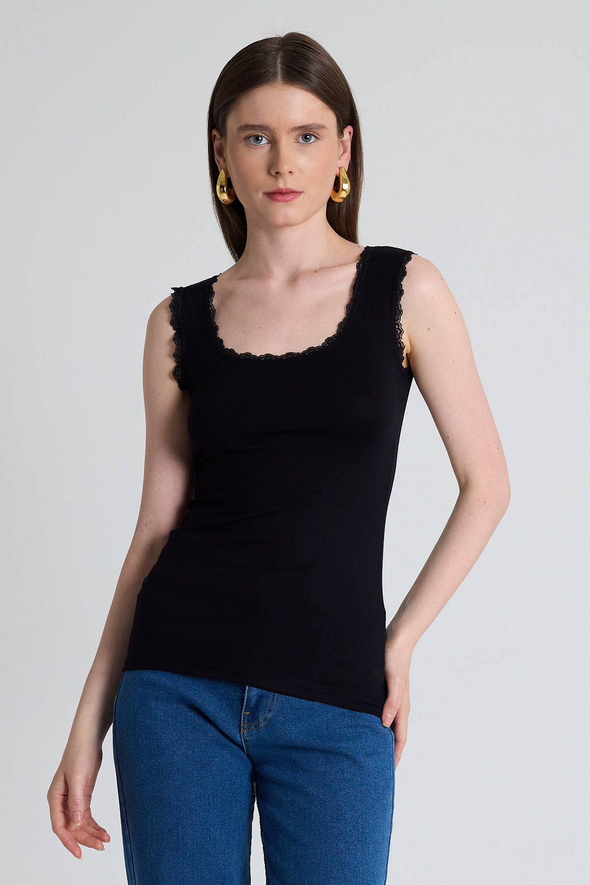 Siyah U Yaka Dantel Detaylı Kalın Askılı Atlet 3602