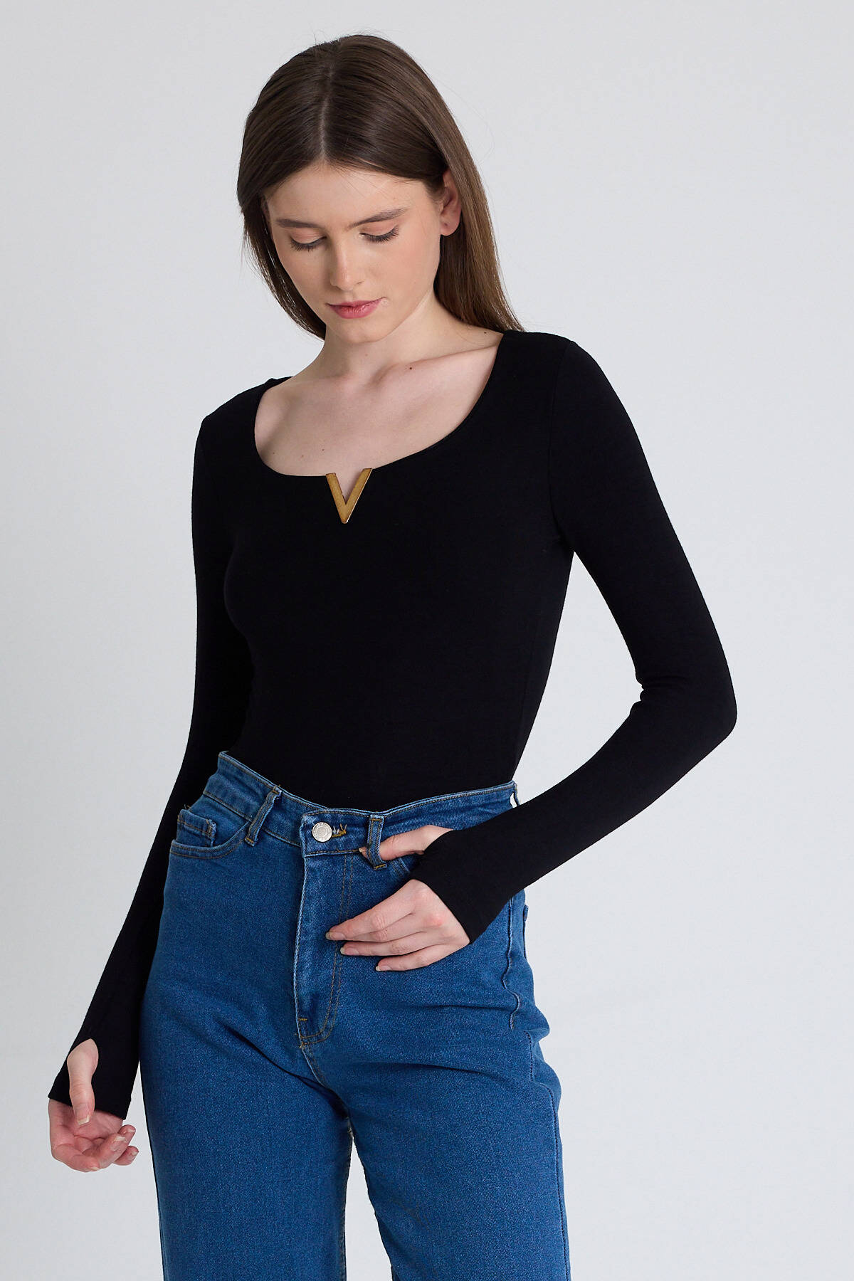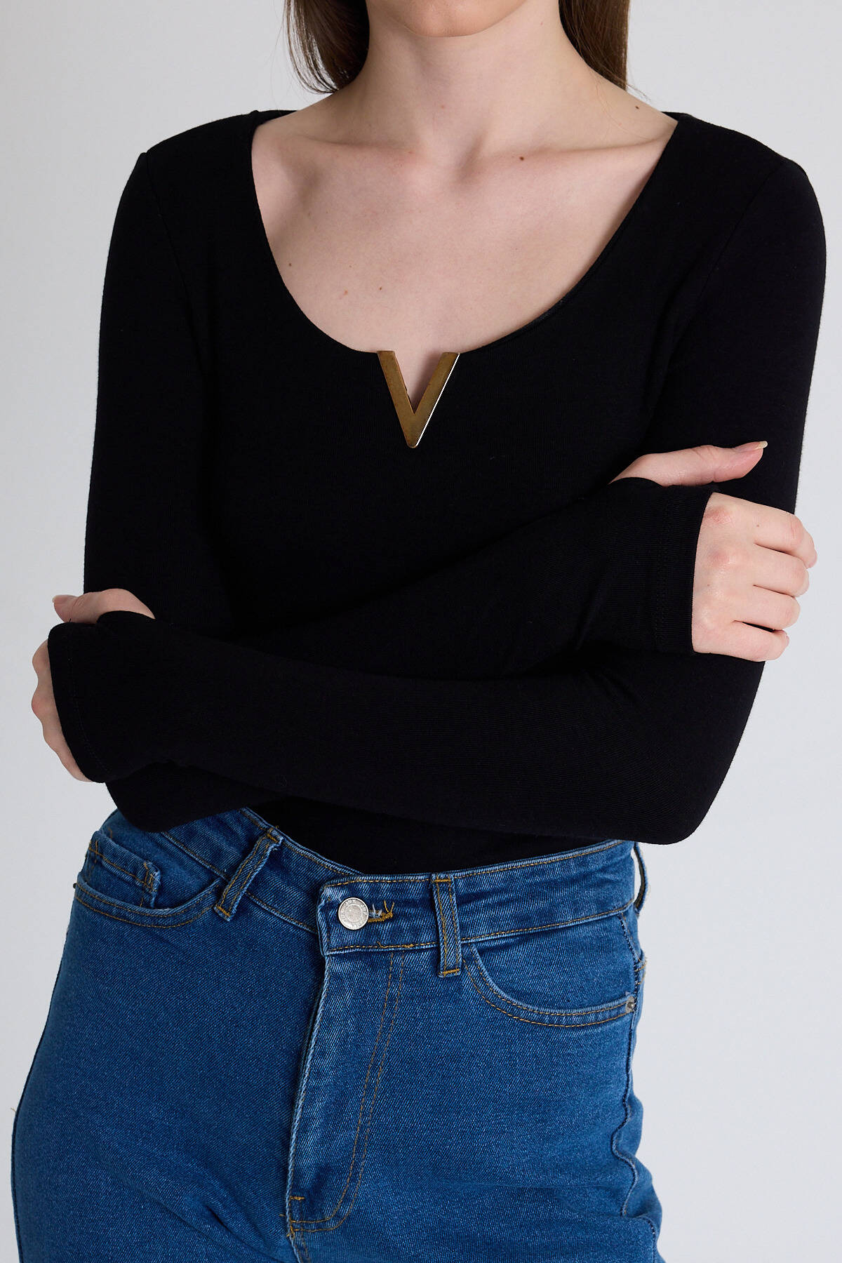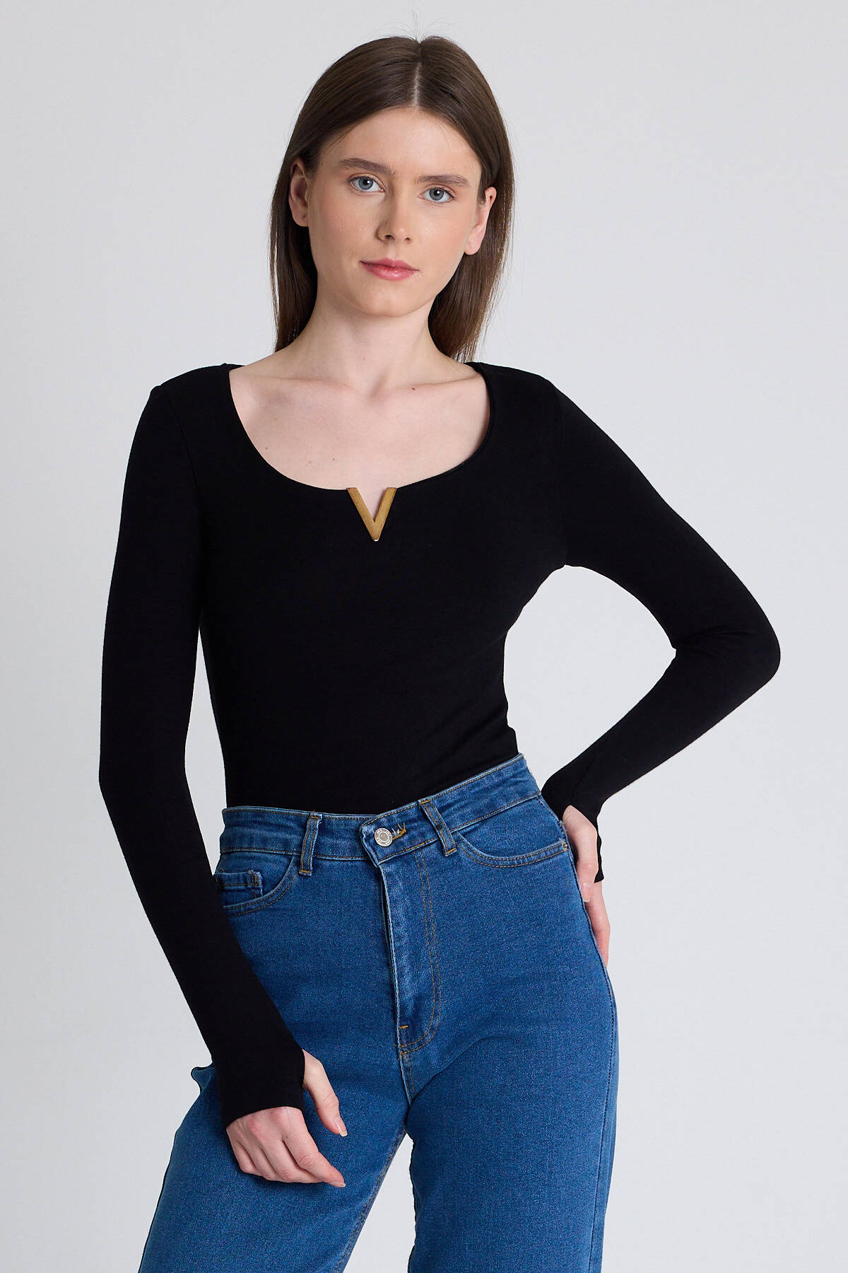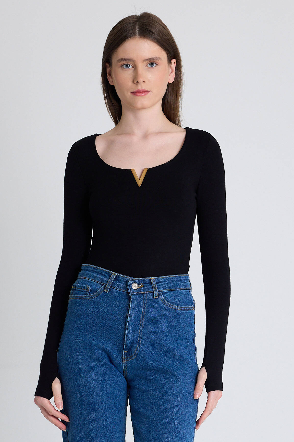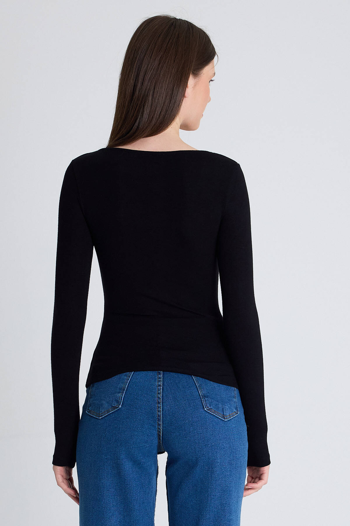 Siyah Viskoz/Yumuşak Kumaş Aksesuarlı Parmak Geçme Detaylı Bluz 1476