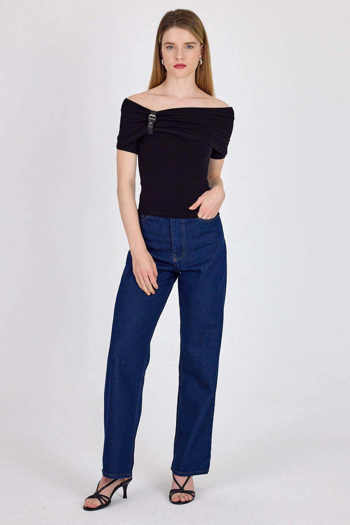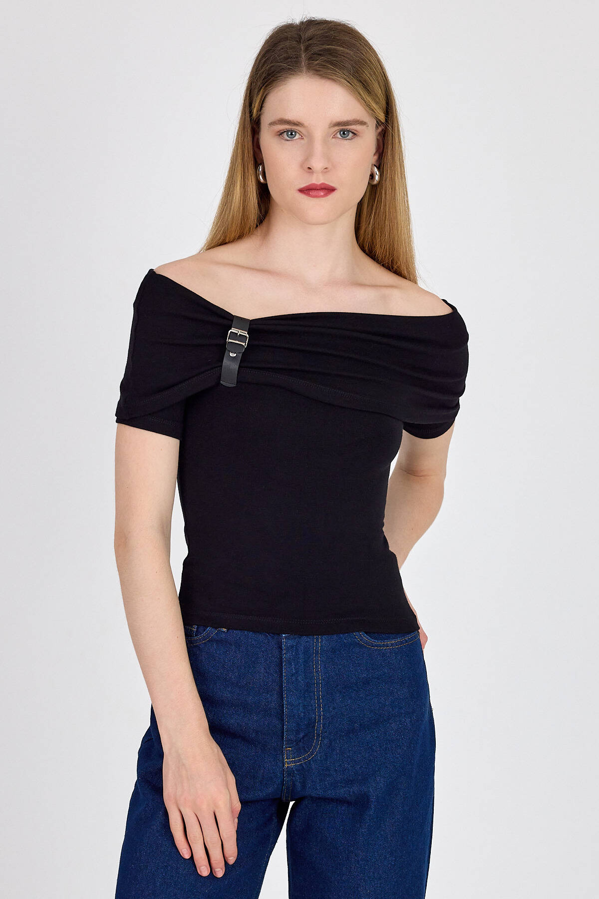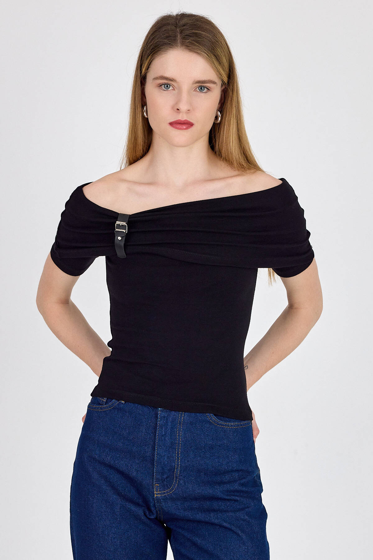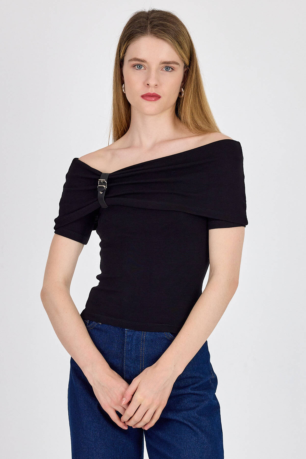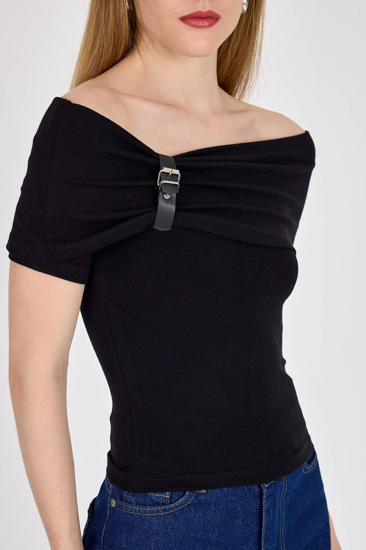 Siyah Viskoz/Yumuşak Kumaş Madonna Yaka Toka Detaylı Bluz 1475