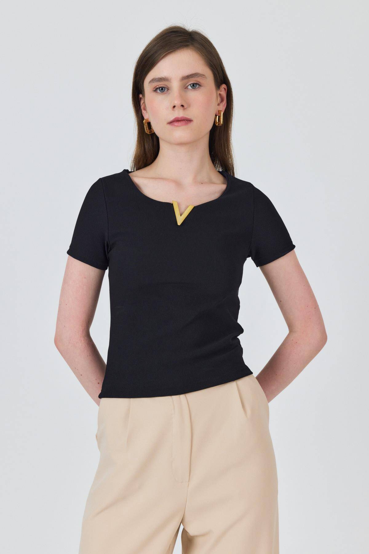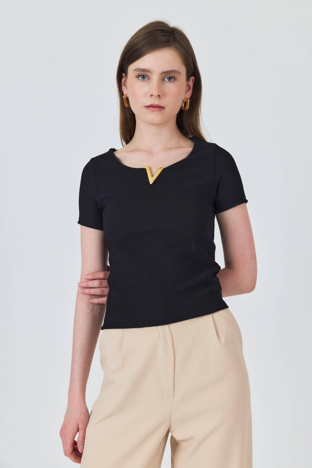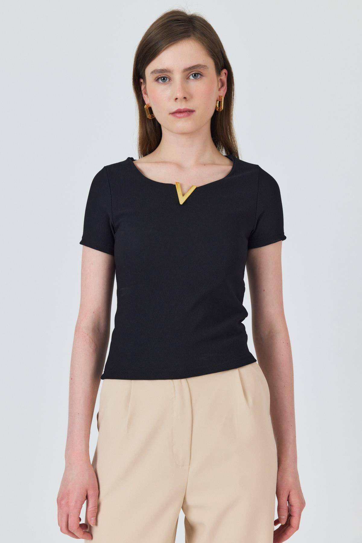 Siyah Yaka Aksesuar Detaylı Örme Tişört 2224
