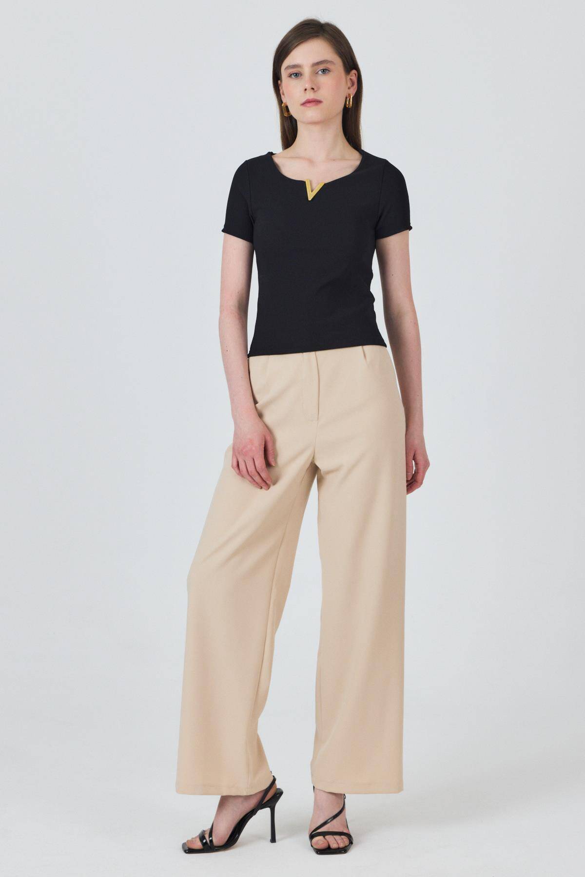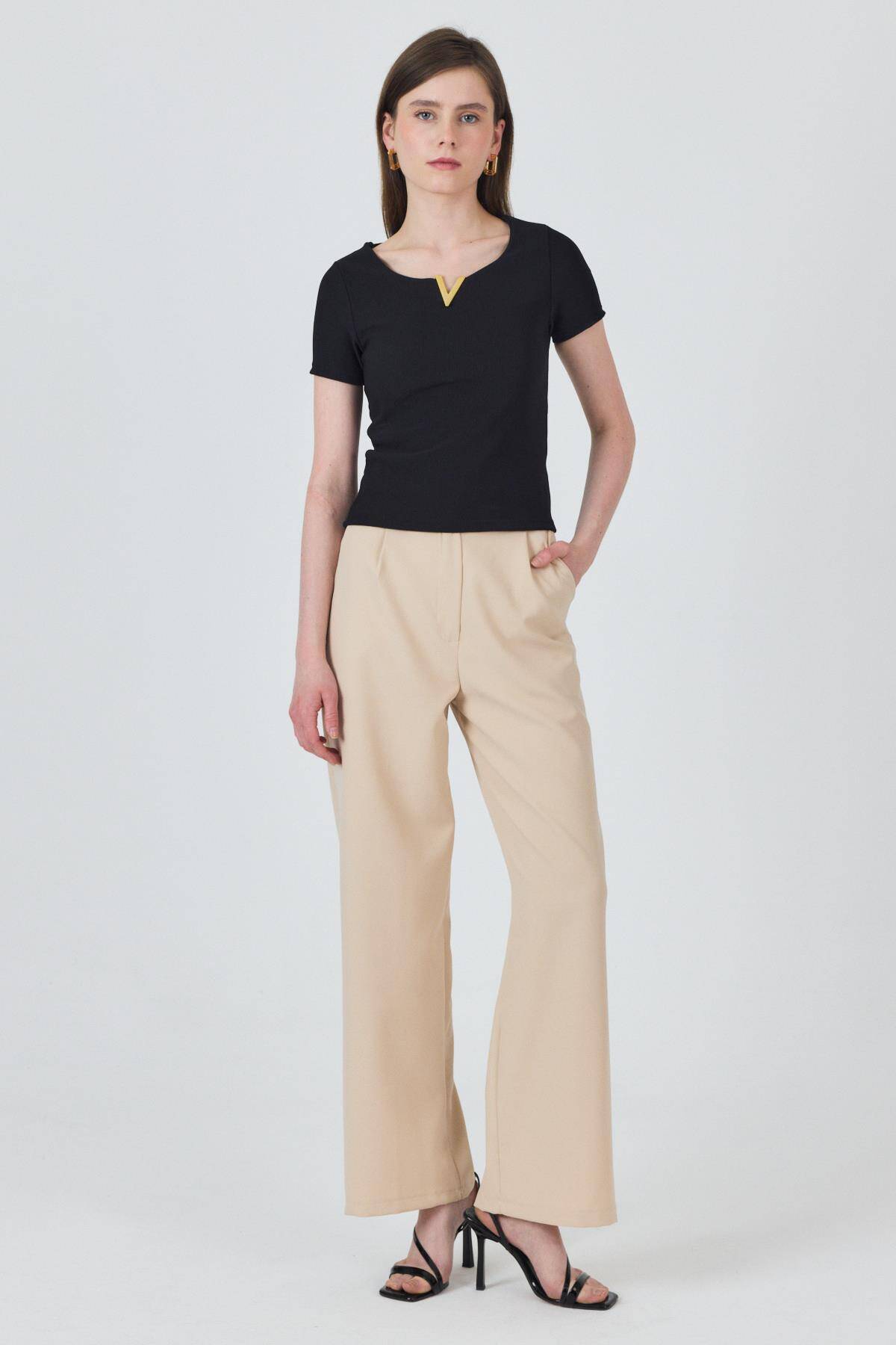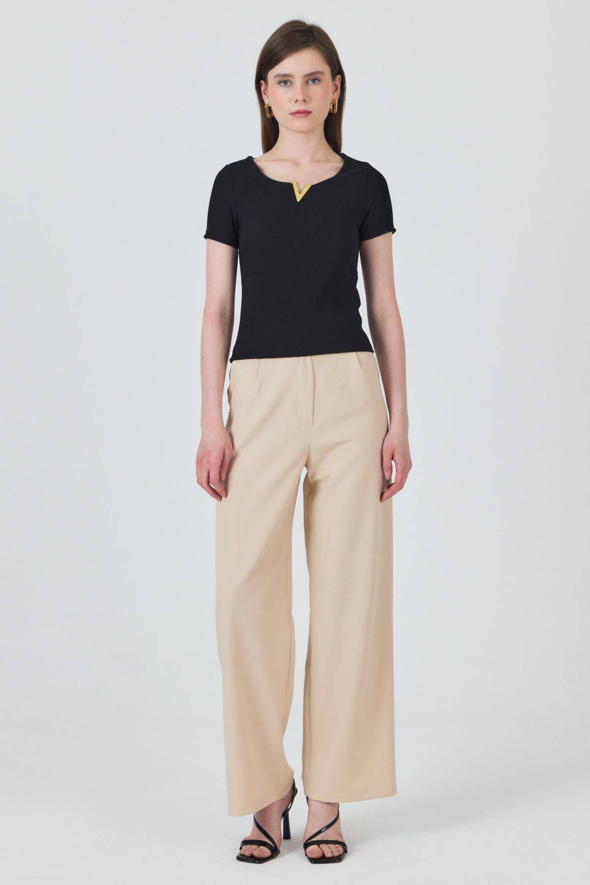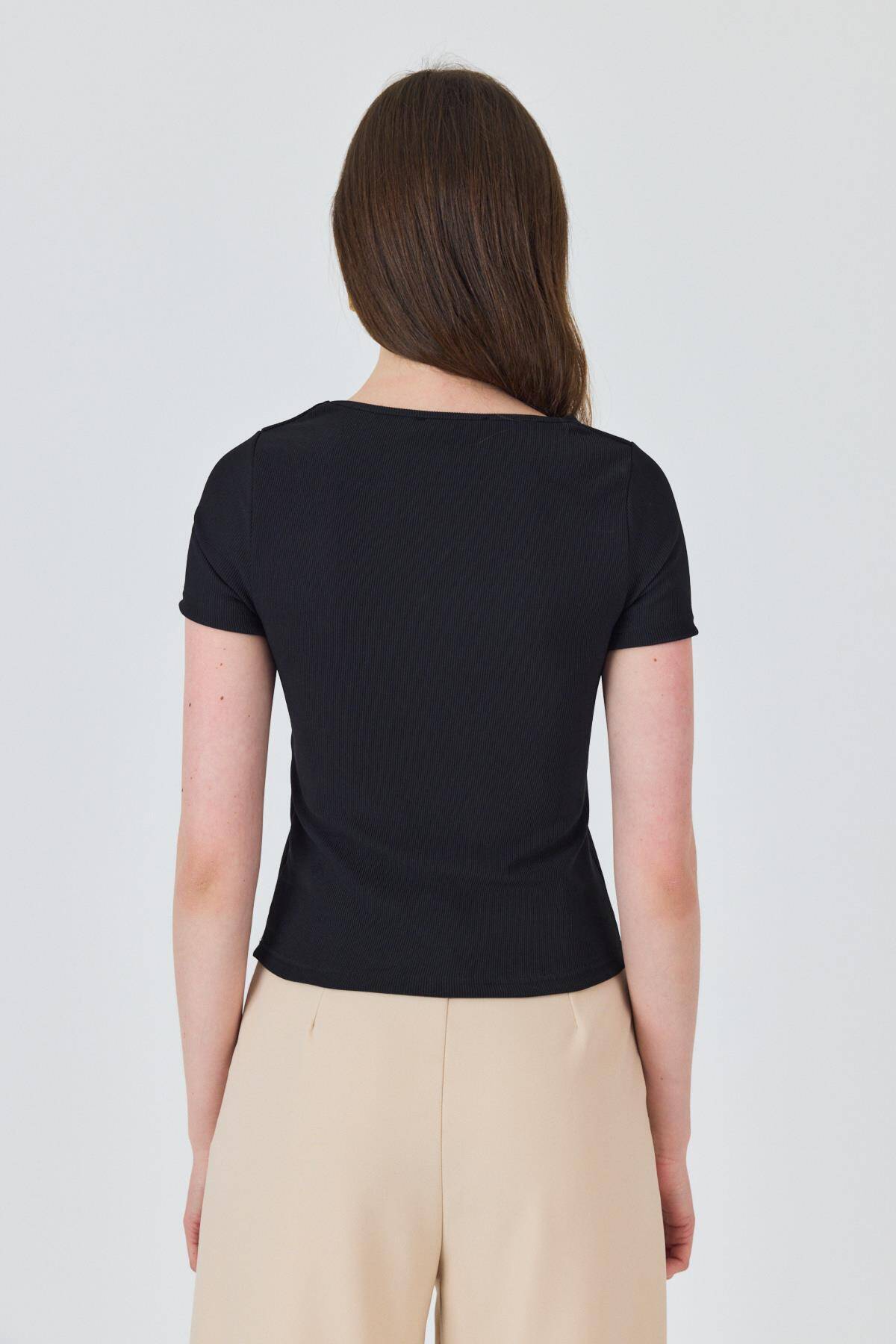 Siyah Yaka Aksesuar Detaylı Örme Tişört 2224