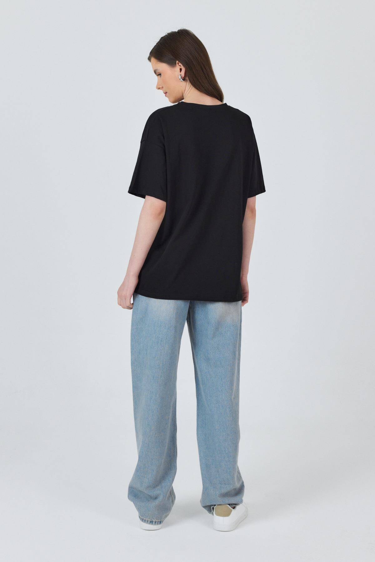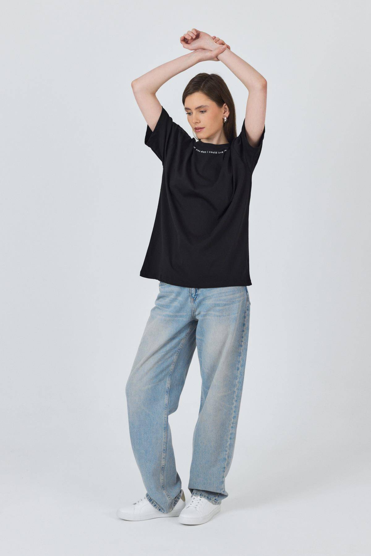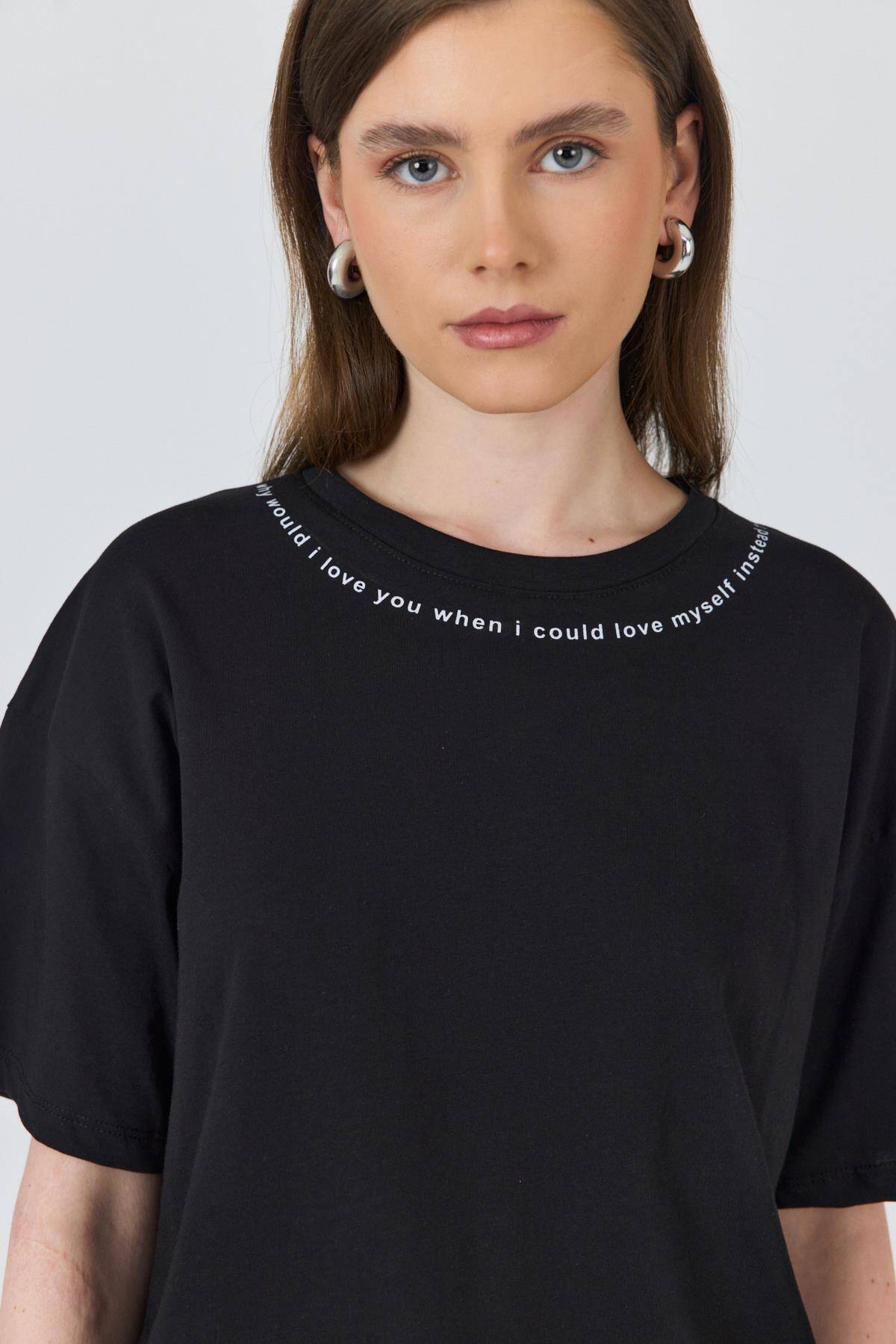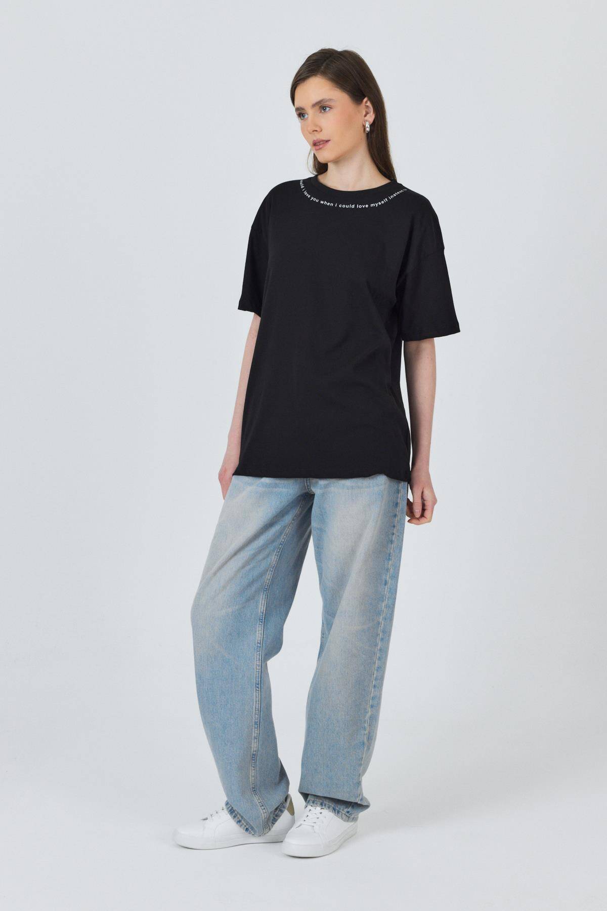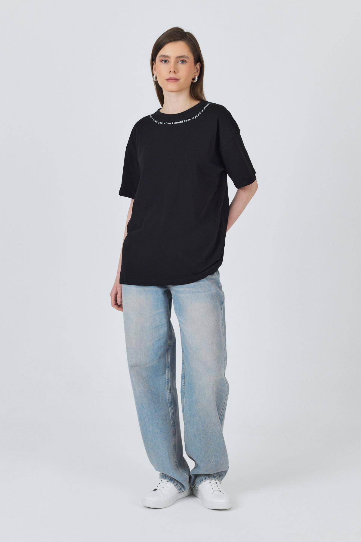 Siyah Yaka Yazı Baskılı Oversize Pamuklu Tişört 2150-34M