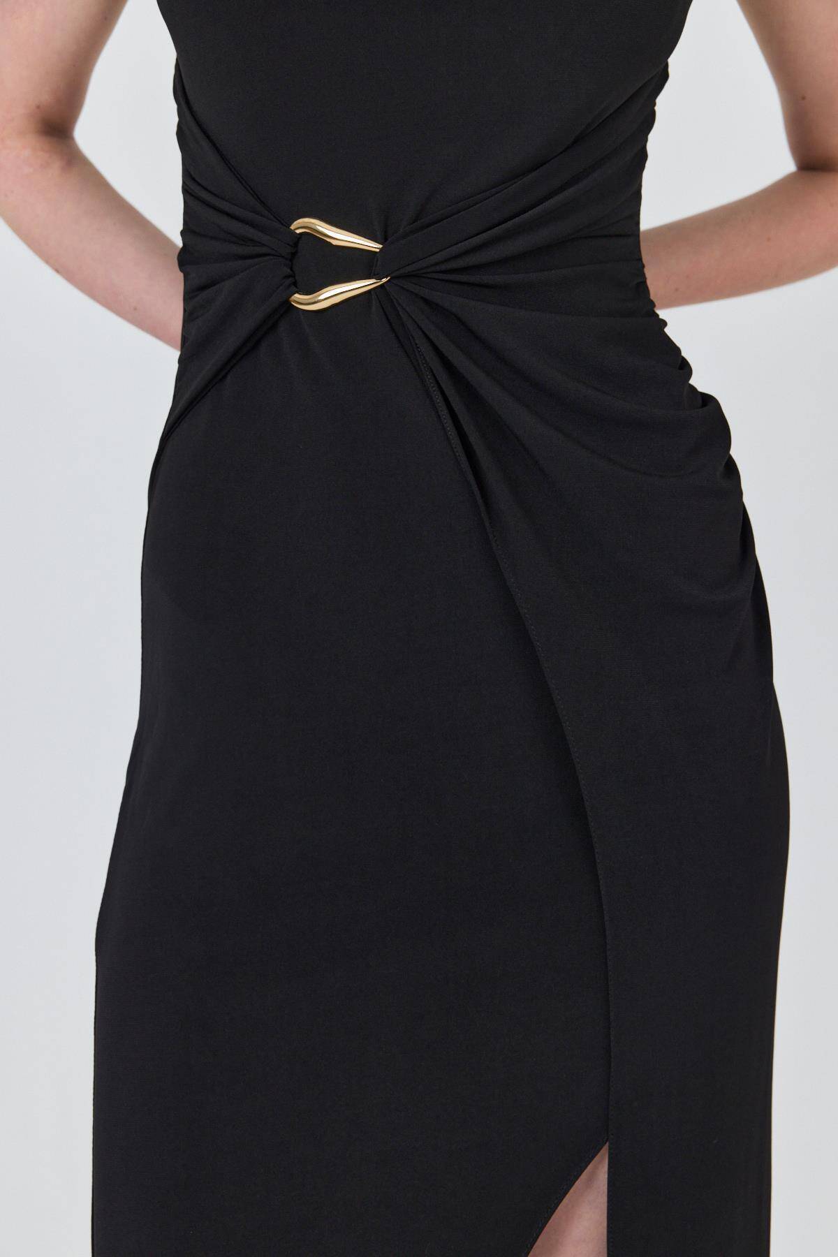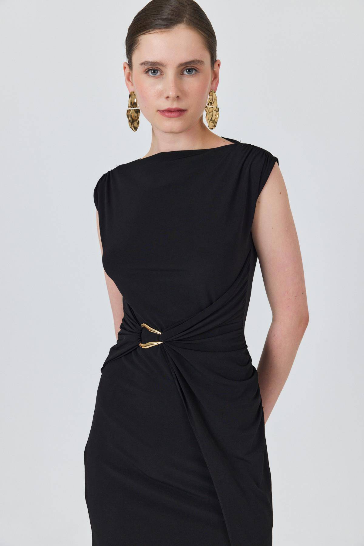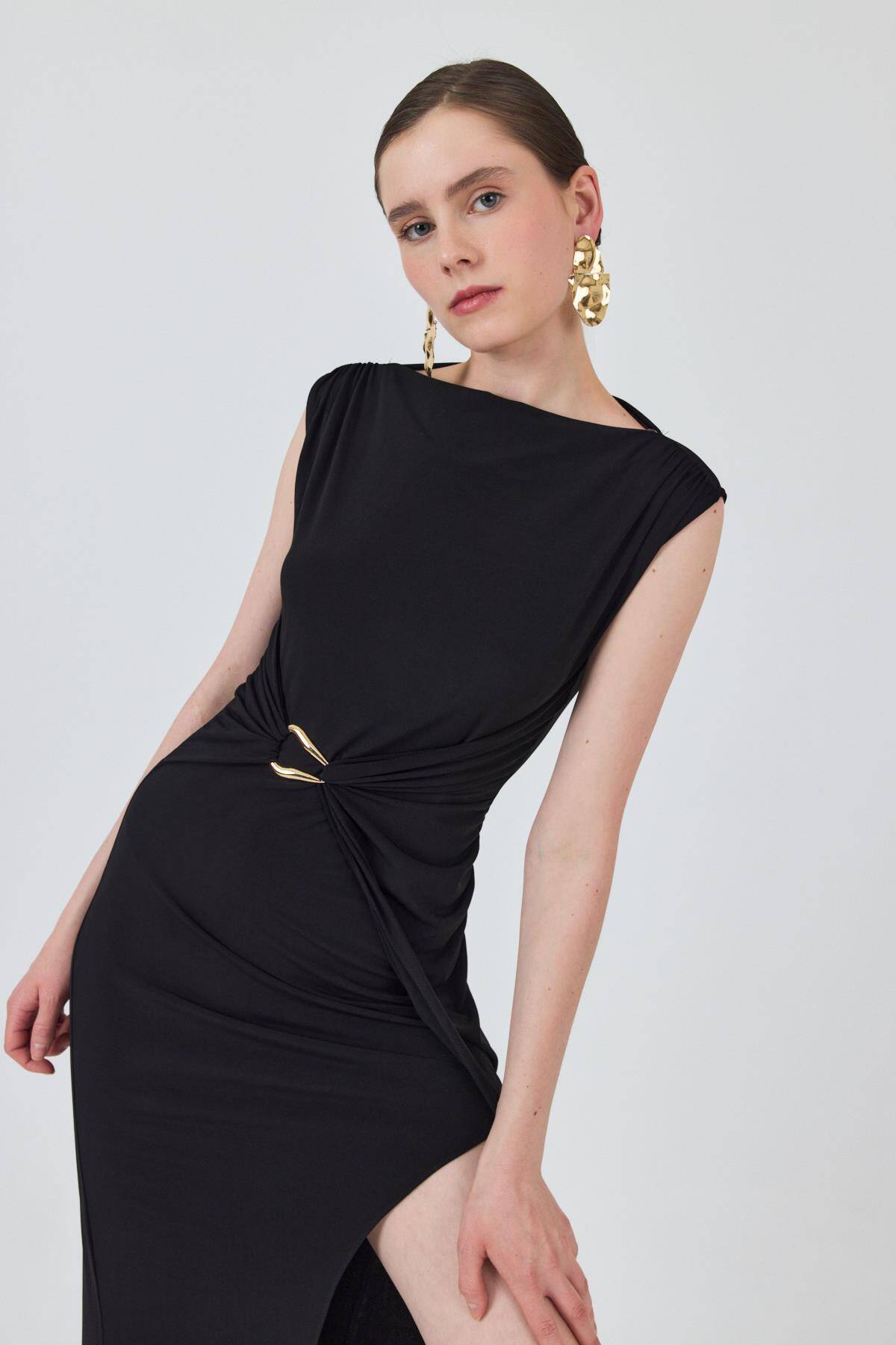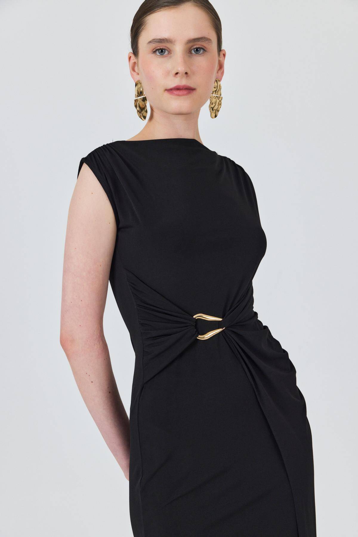 Siyah Yan Büzgü Toka Detaylı Elbise 251605