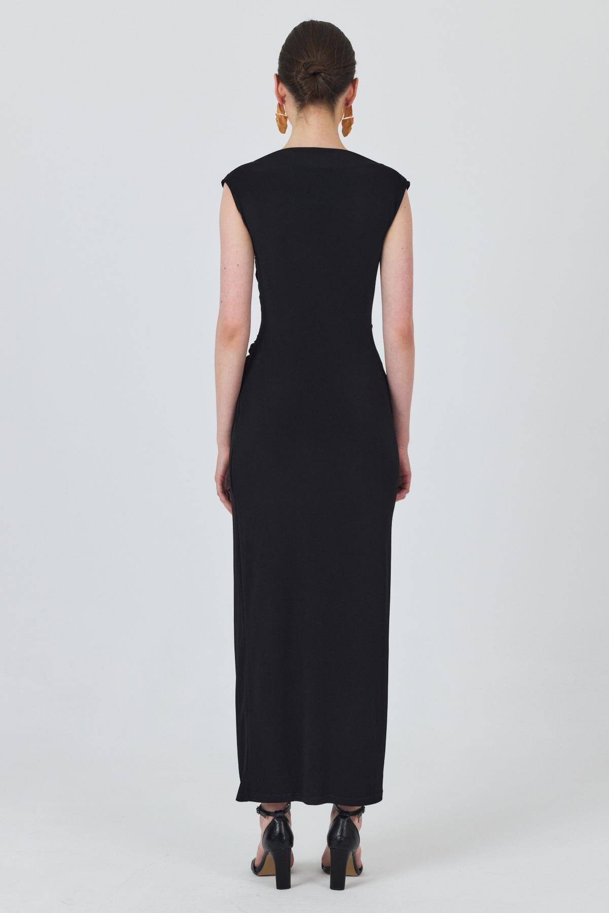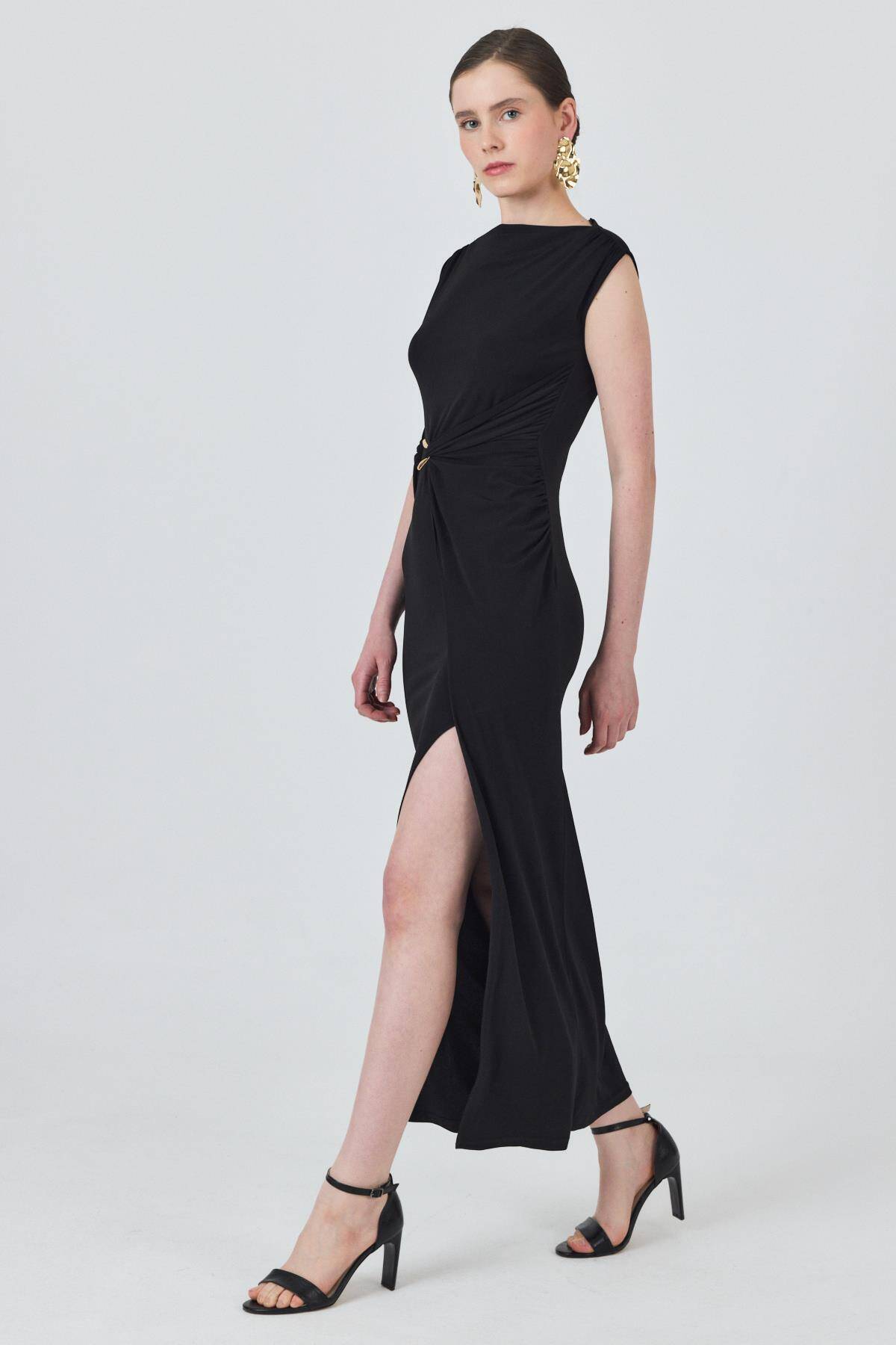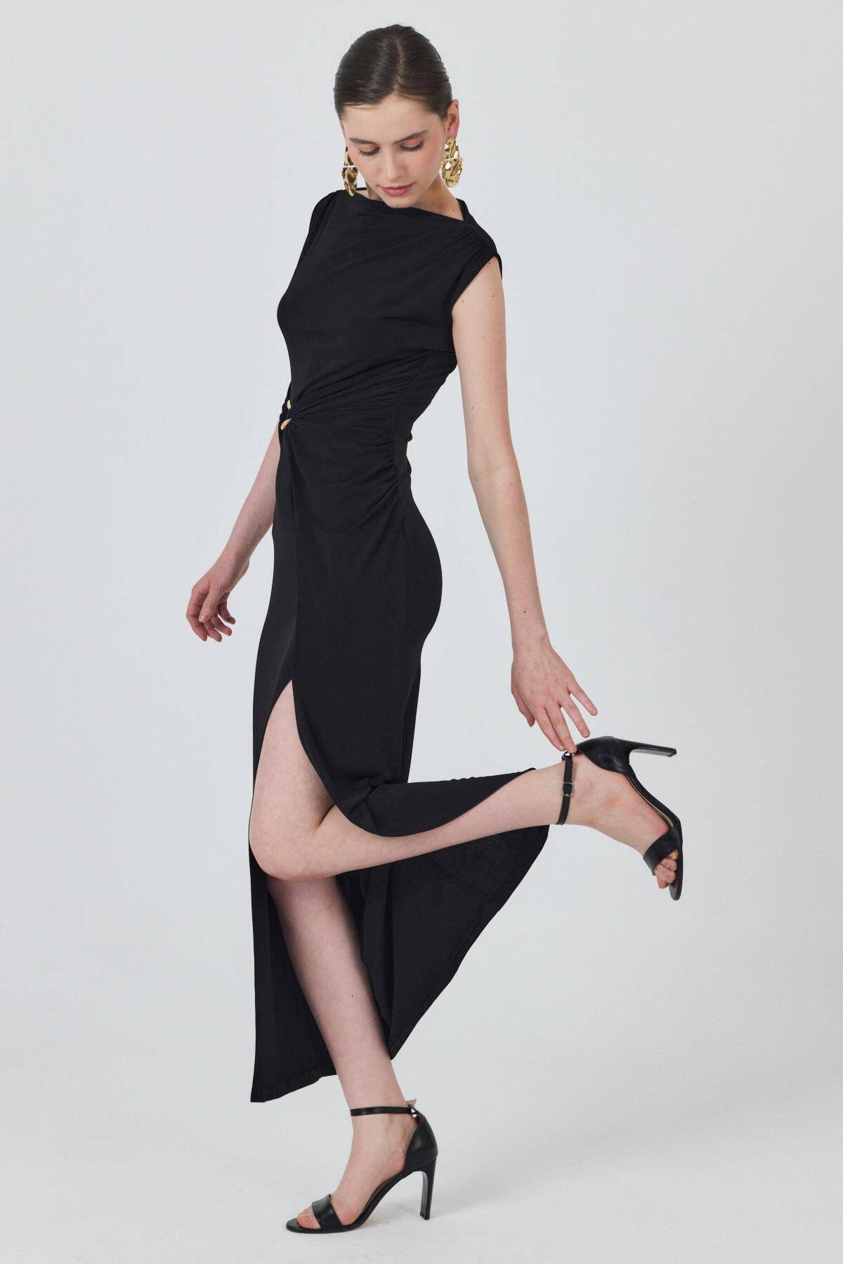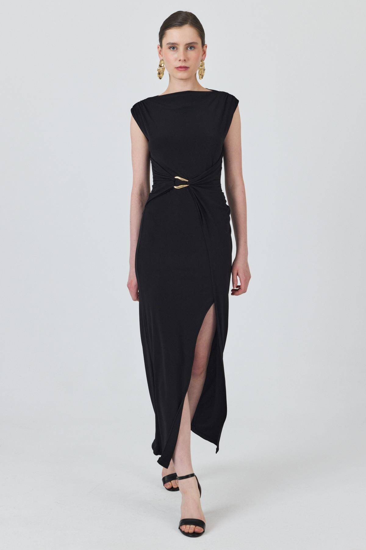 Siyah Yan Büzgü Toka Detaylı Elbise 251605