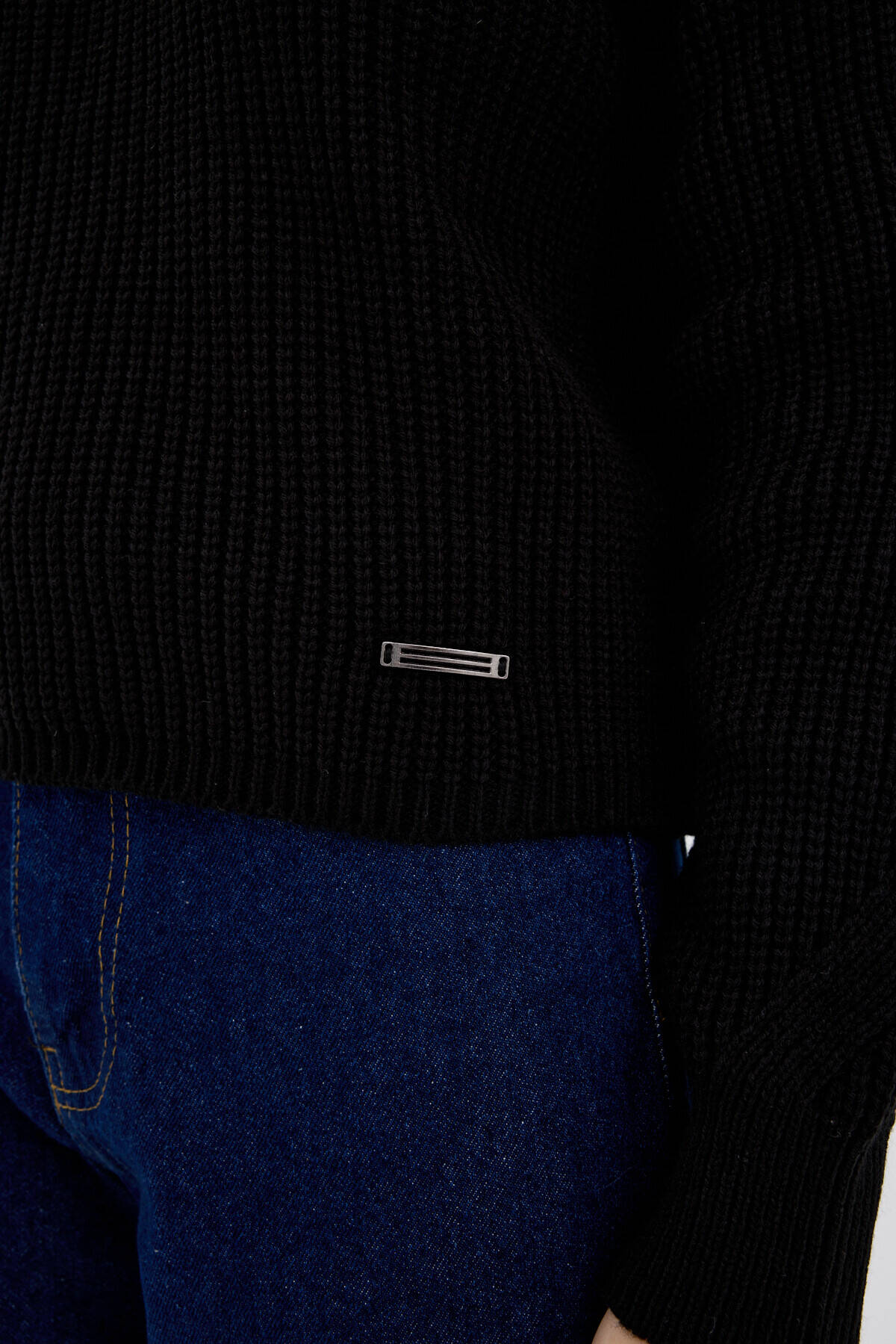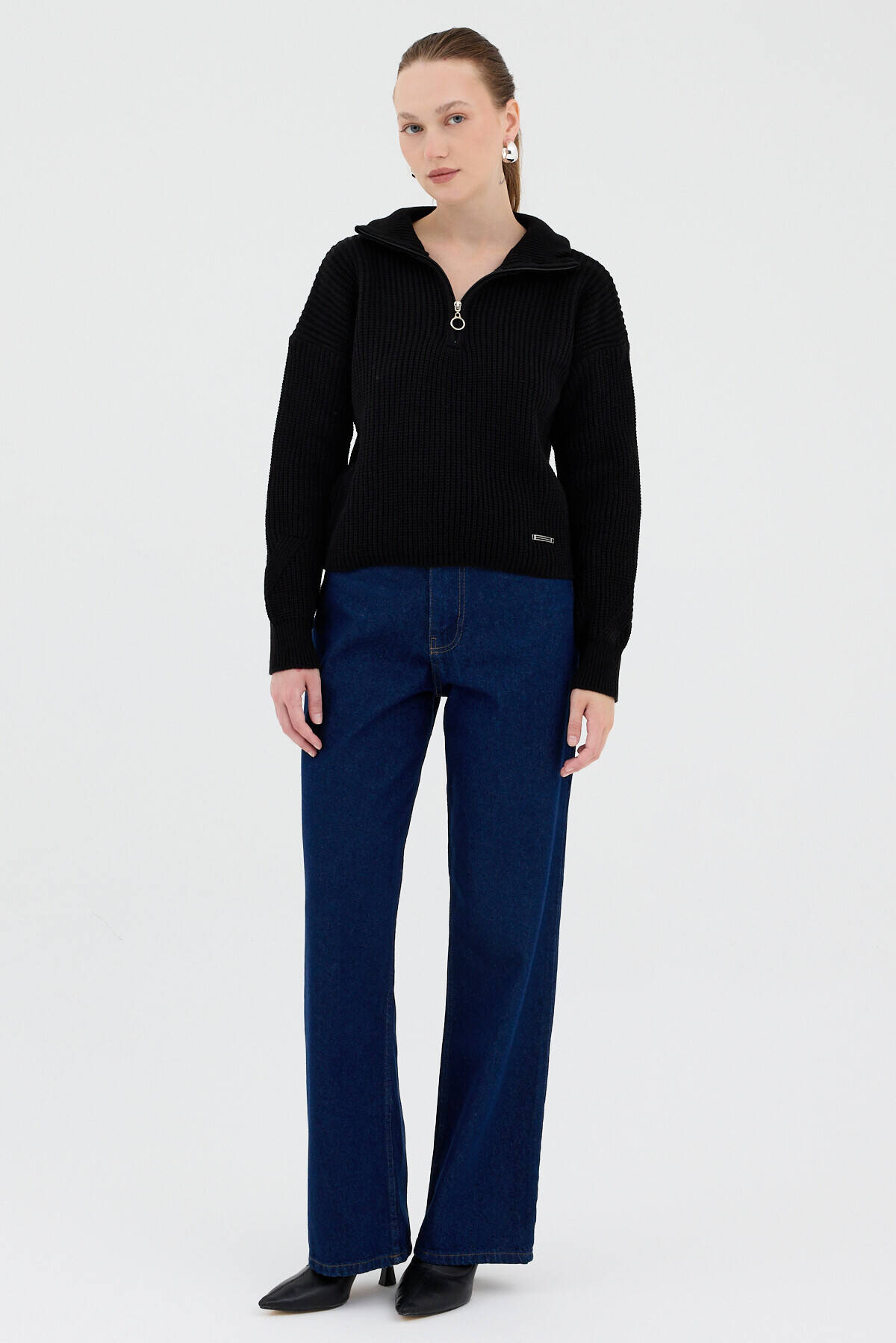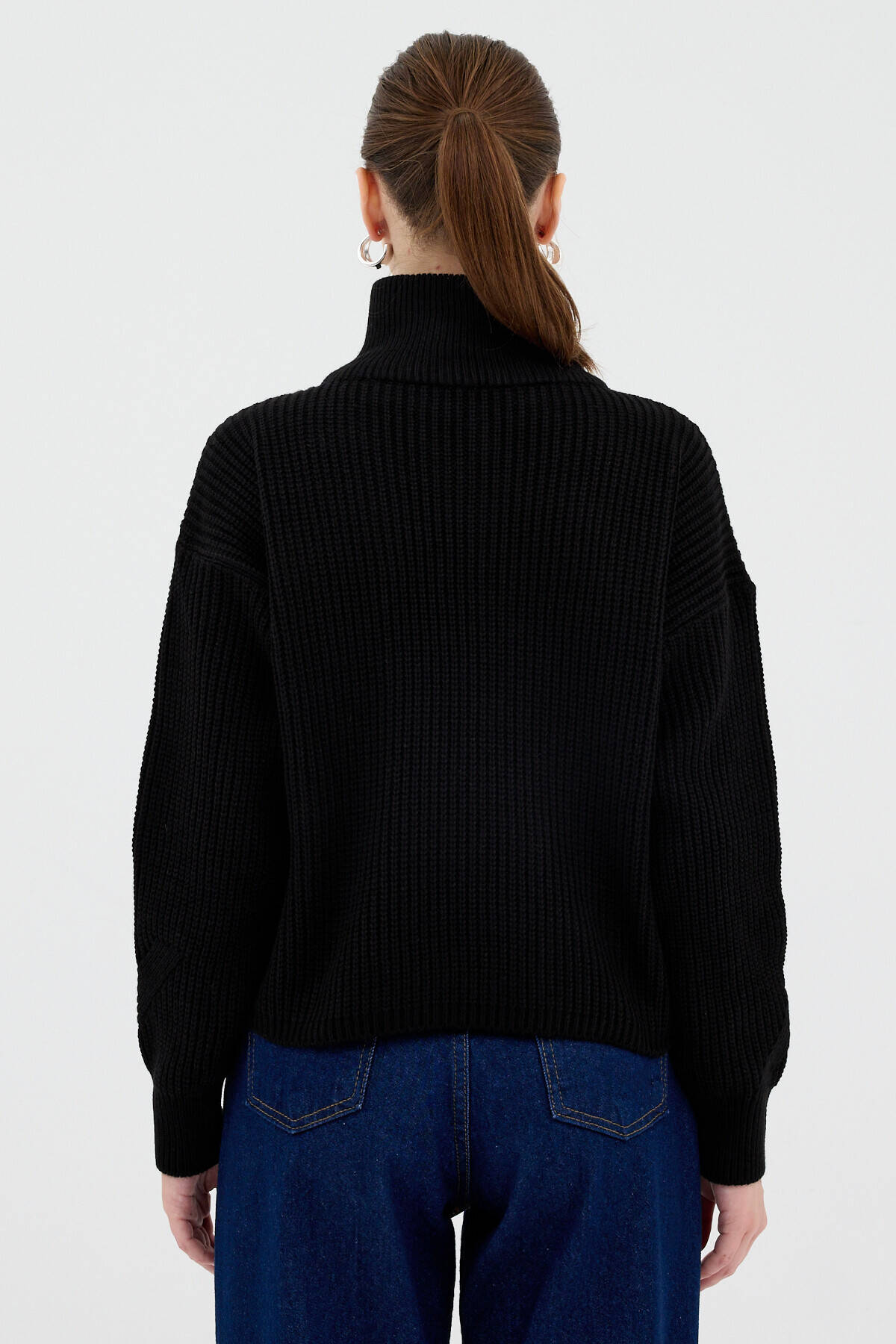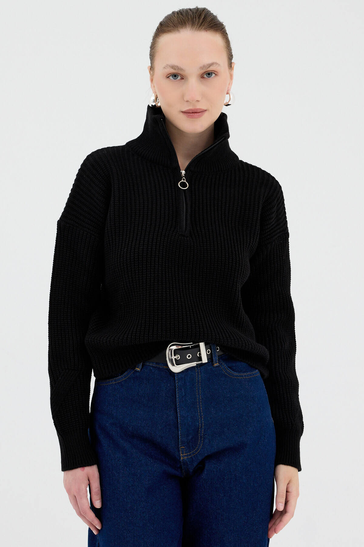 Siyah Yarım Fermuarlı Crop Triko Kadın Kazak7135