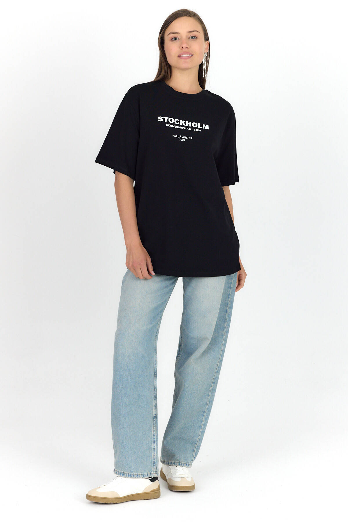 Siyah Yazı Baskılı Bisiklet Yaka OversizeTişört 6056