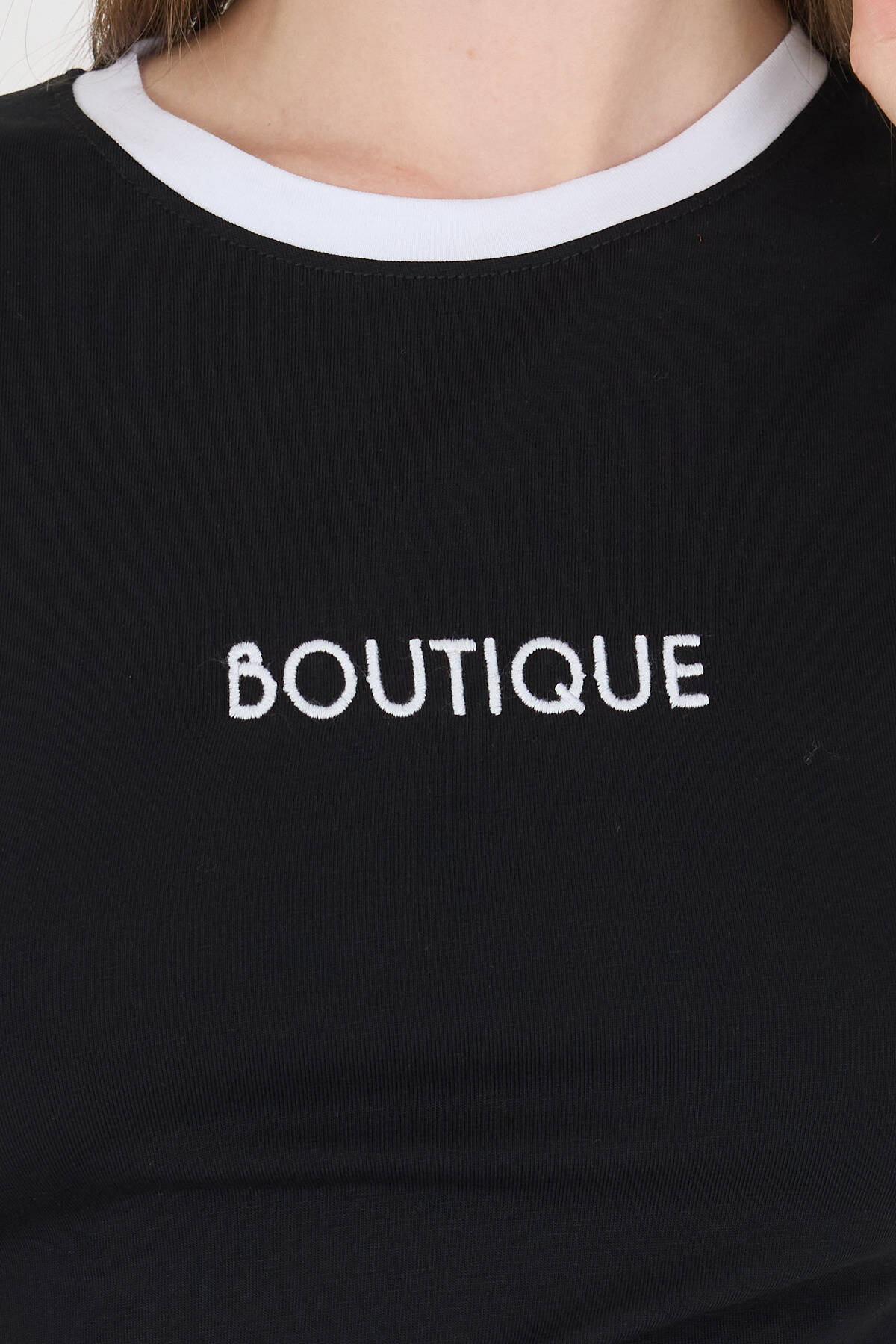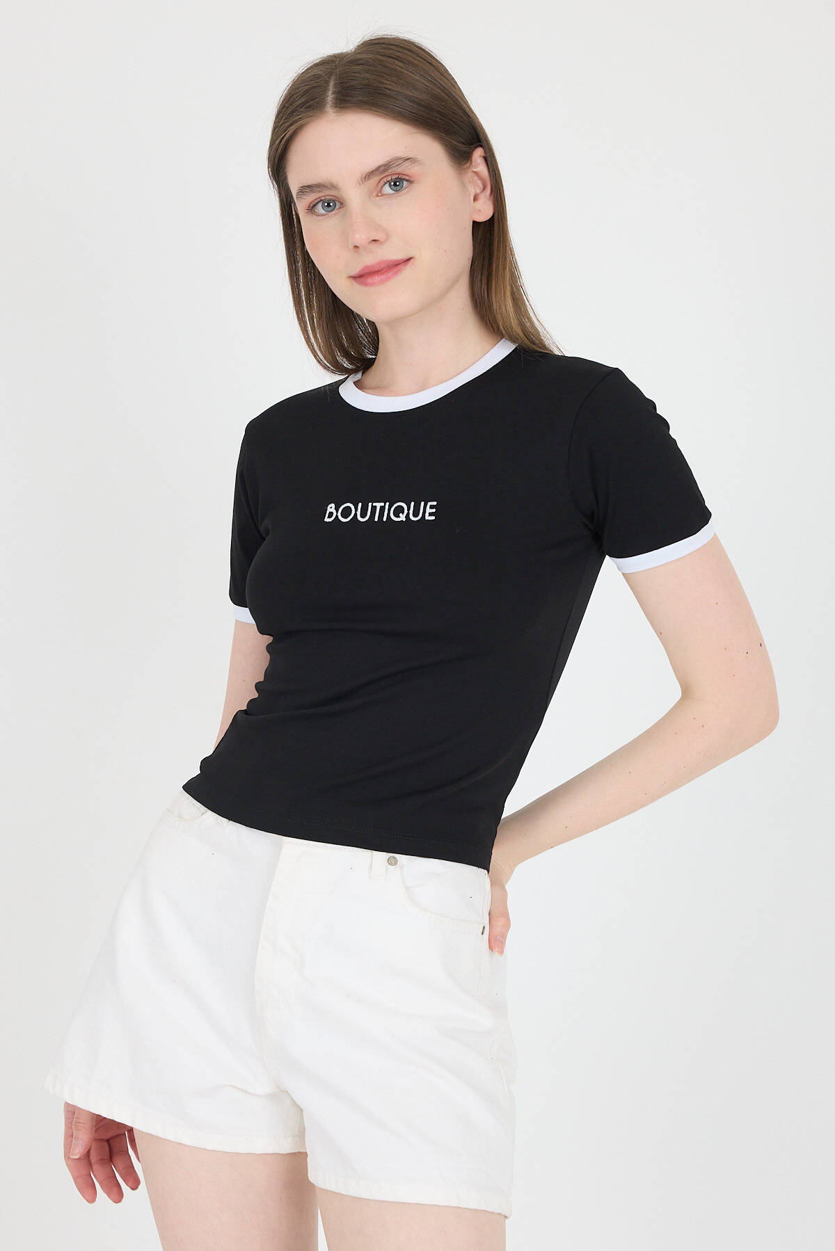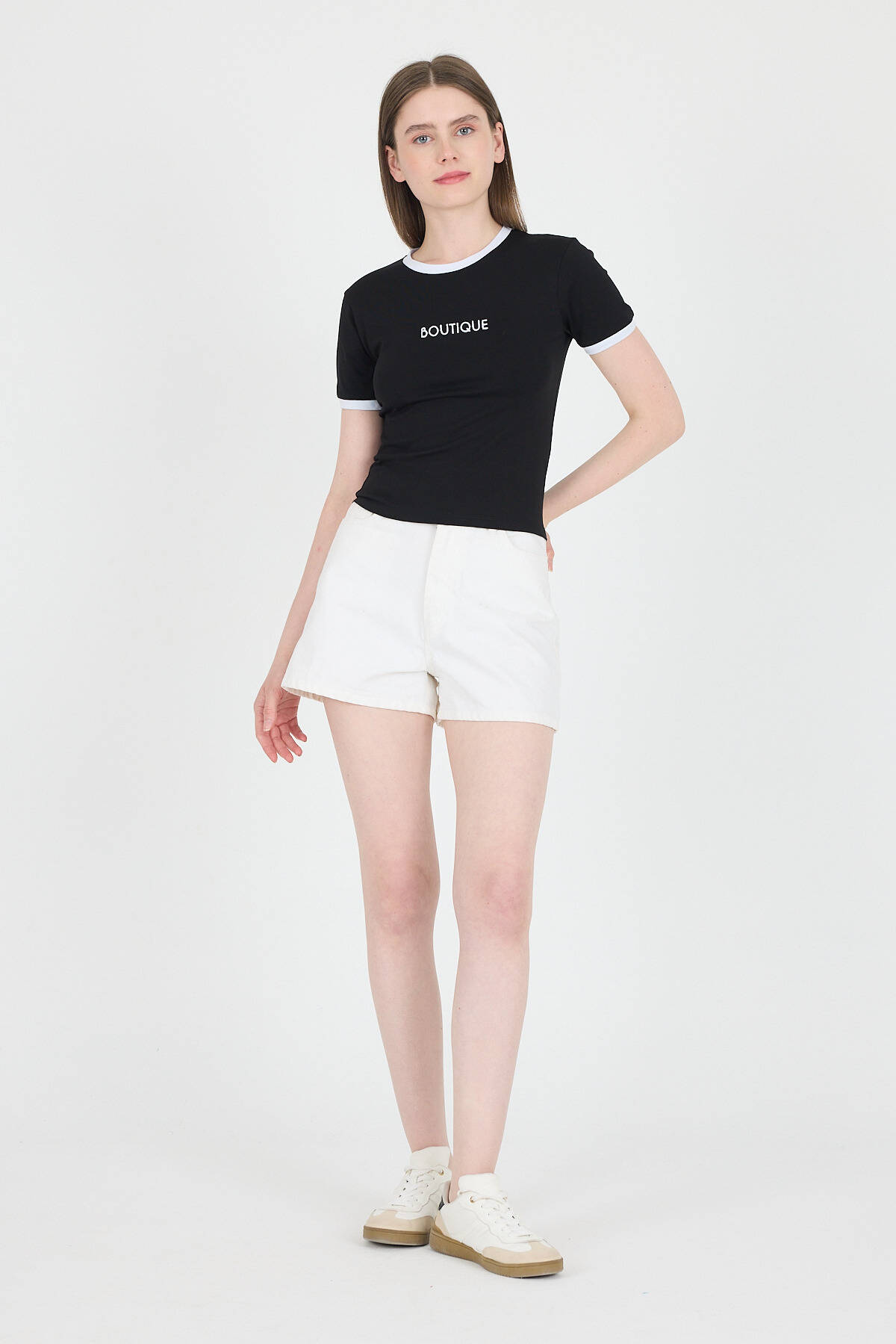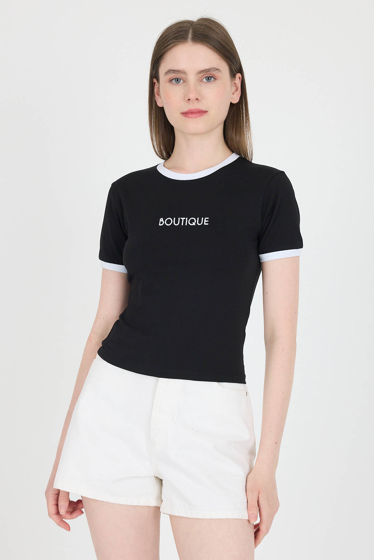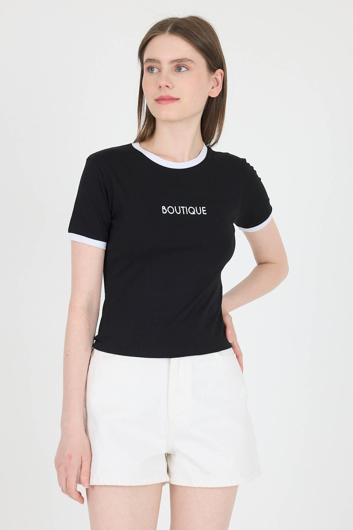 Siyah Yazı Baskılı Biyeli Pamuklu Slim Fit Tişört 9192M