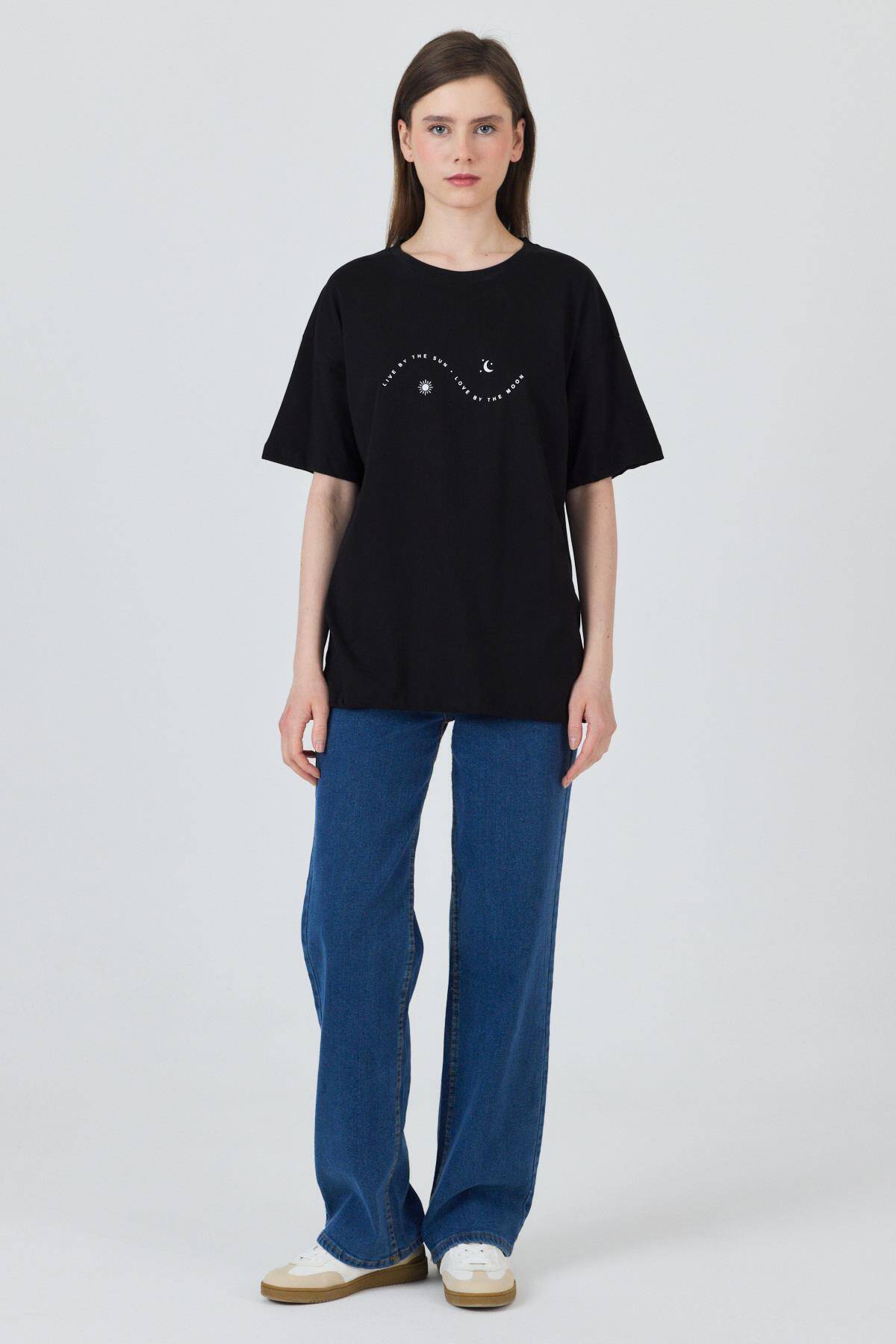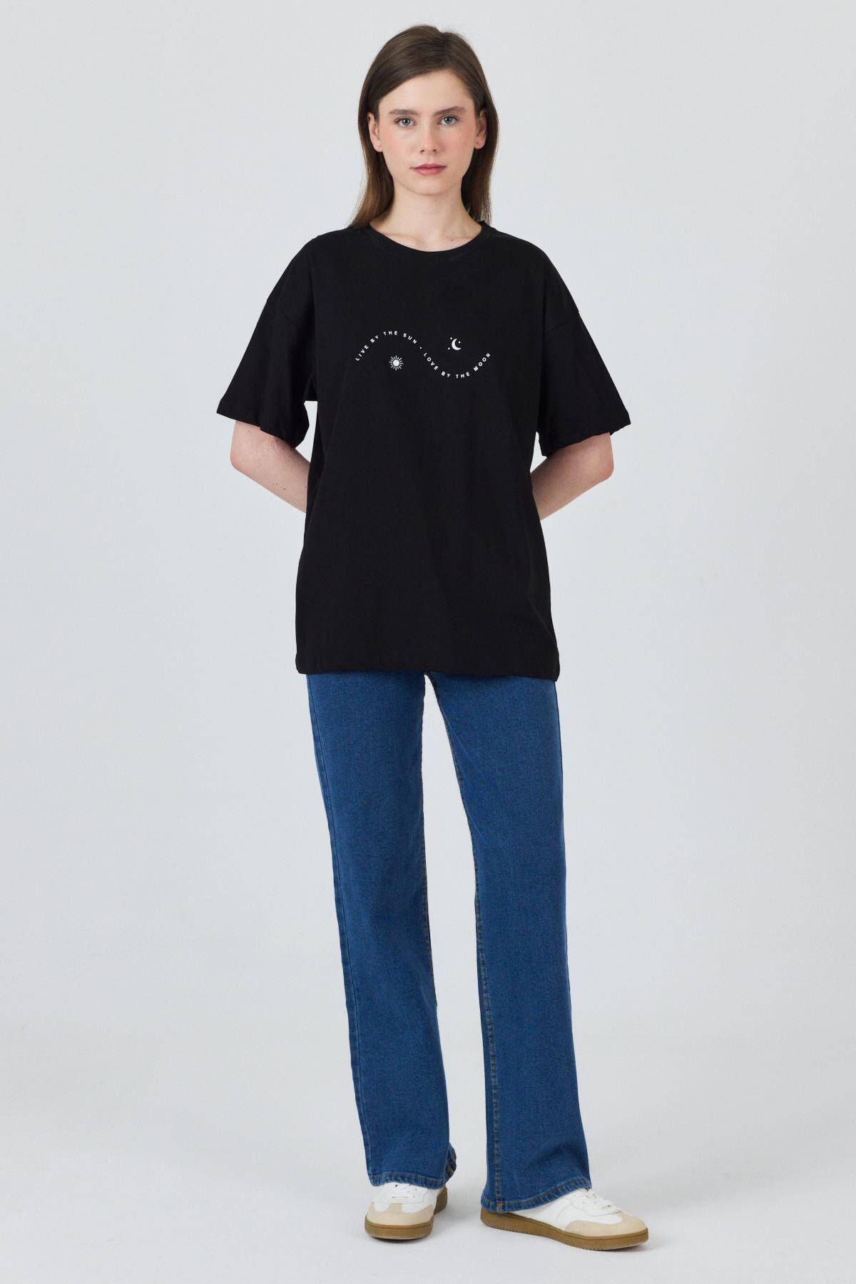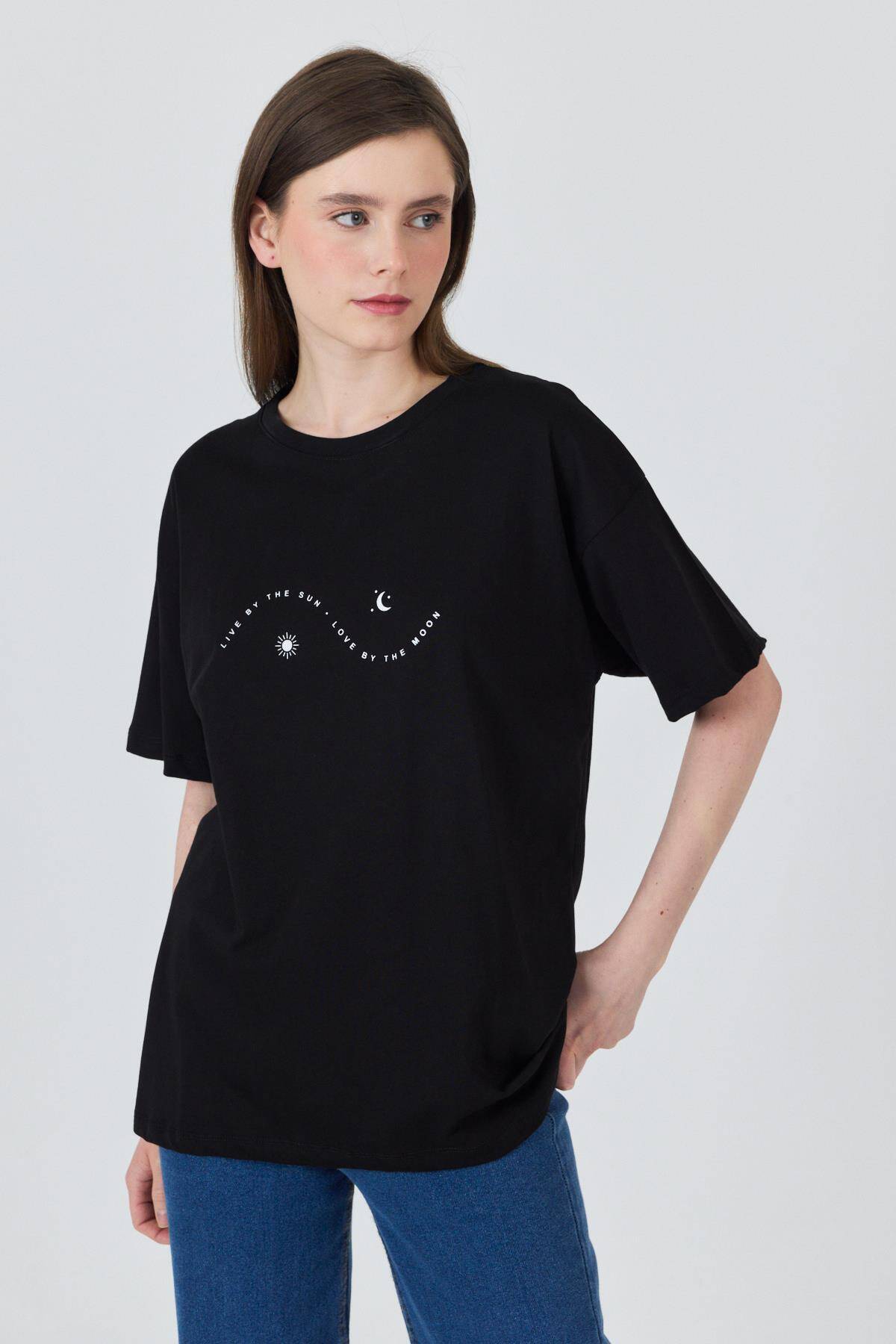 Siyah Yazı Baskılı Oversize Pamuklu Tişört 2150-32M