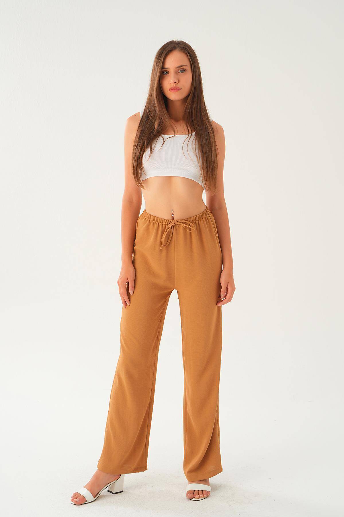 Vizon Beli Lastikli Bol Paça Dokuma Pantolon 4284-1