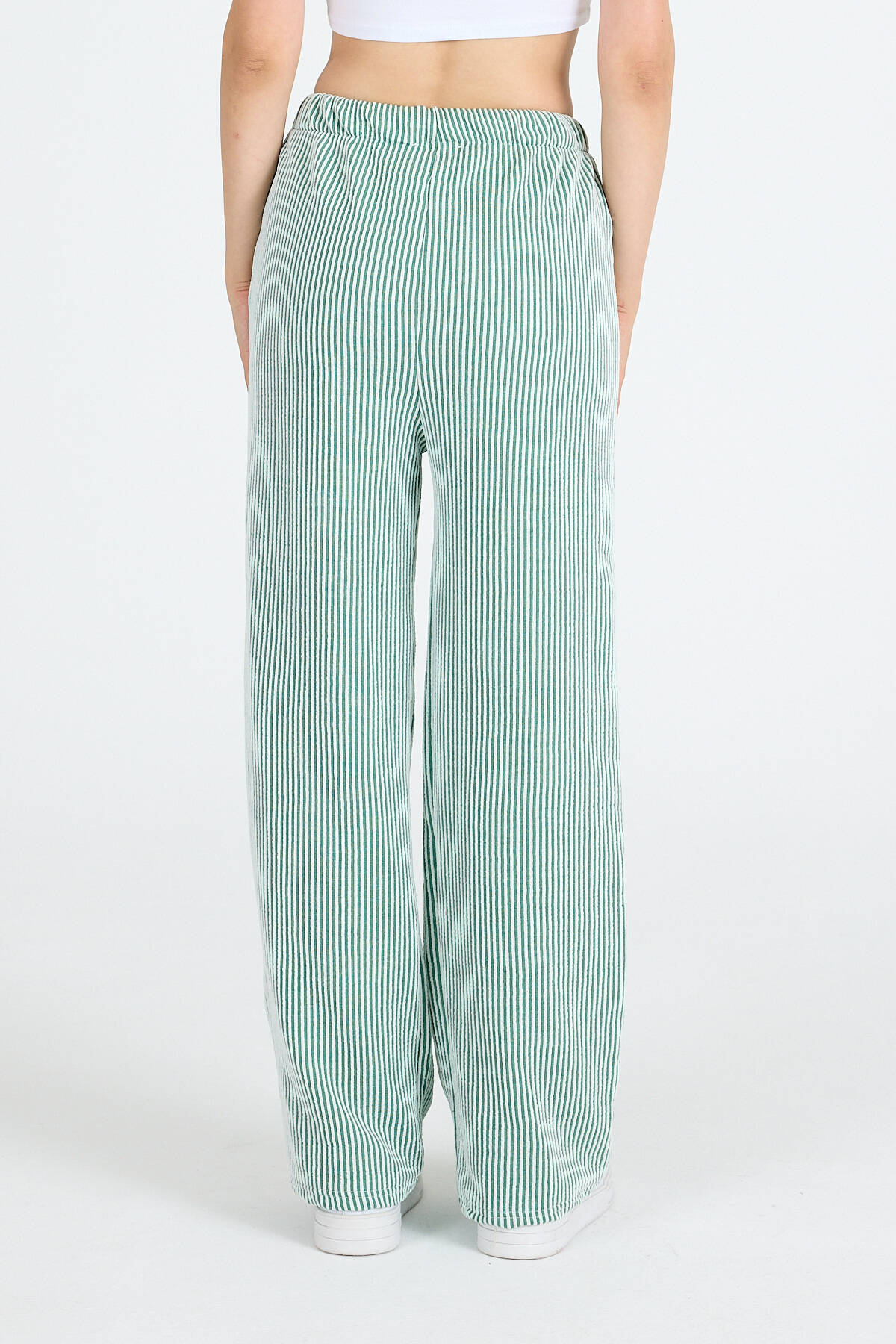 Yeşil Beli Lastikli Çizgili Geniş Paça Dokuma Pantolon 4098