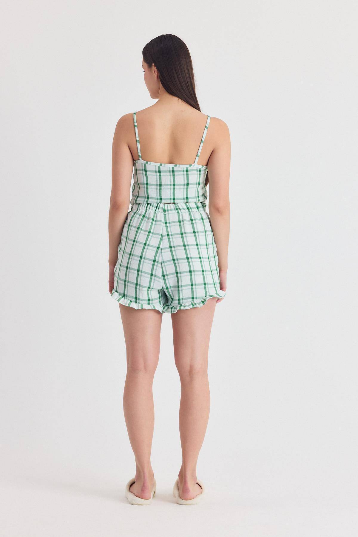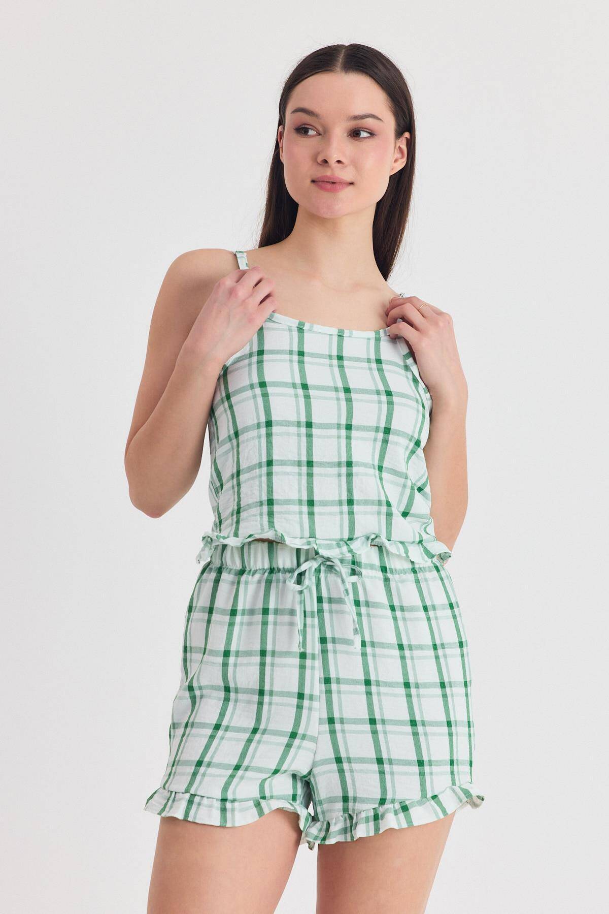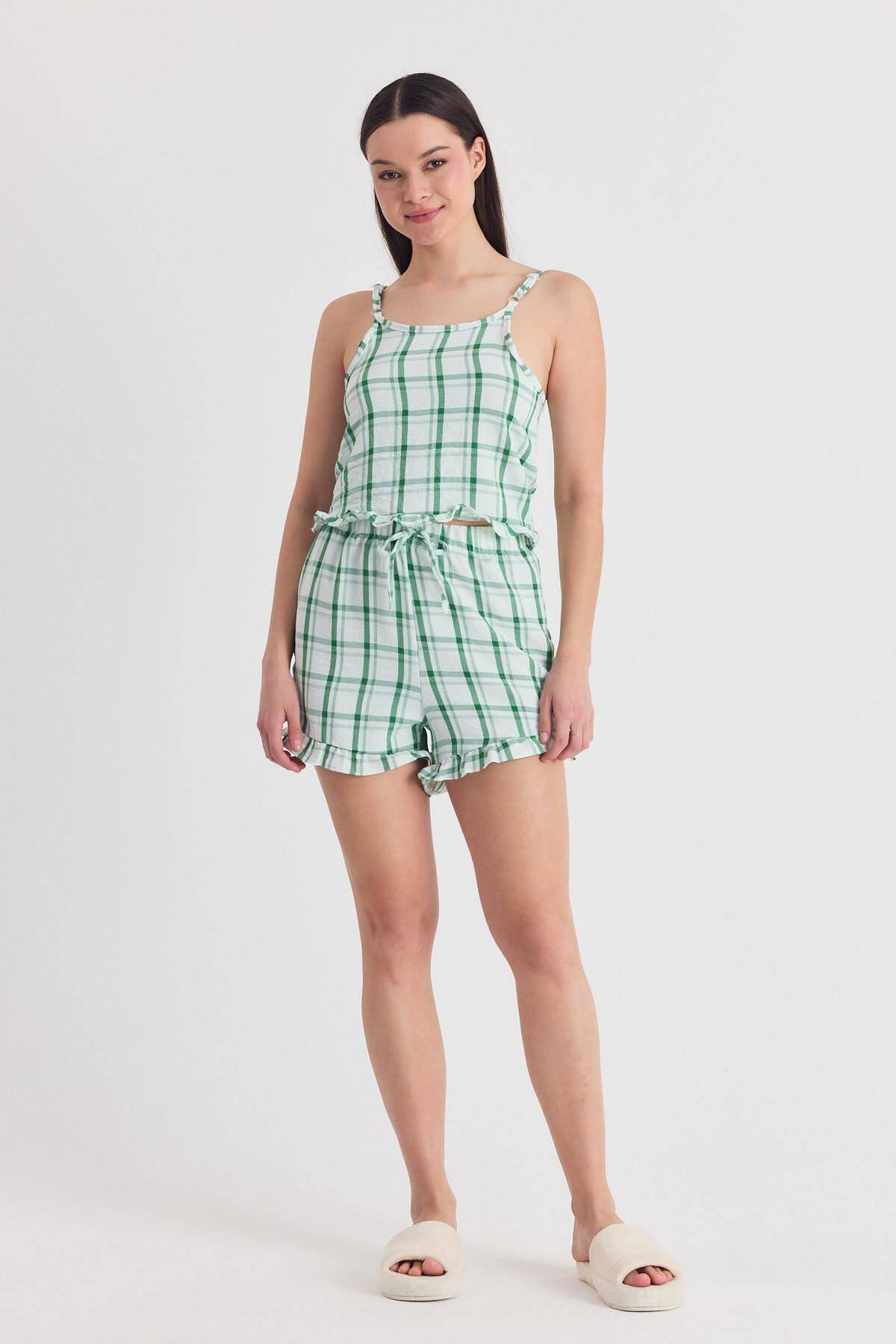 Yeşili Ekose Desenli Fırfır Detaylı Şortlu Takım 4452