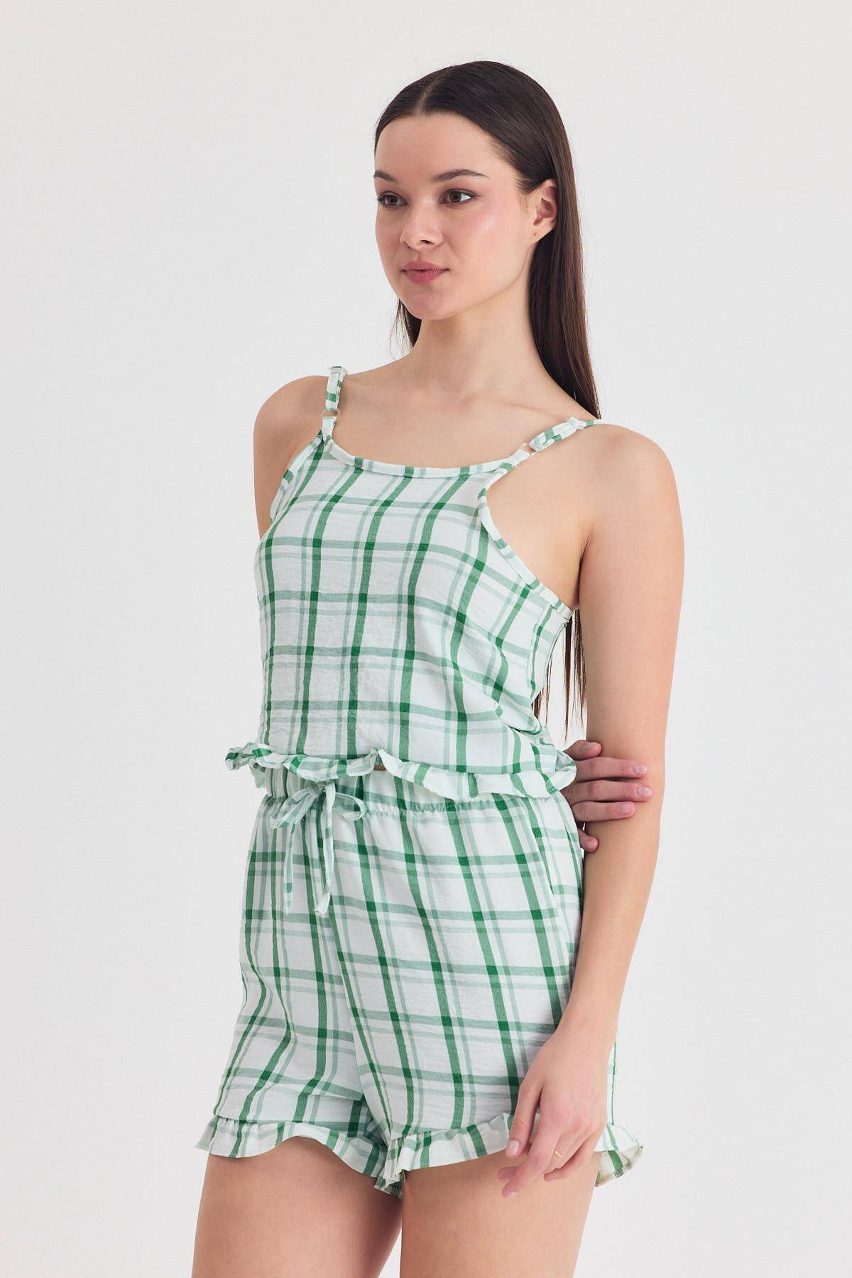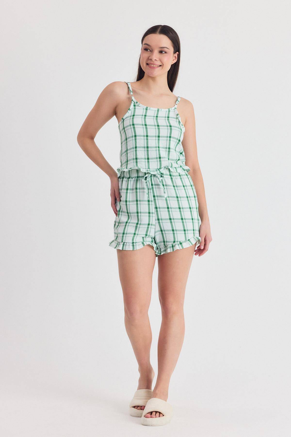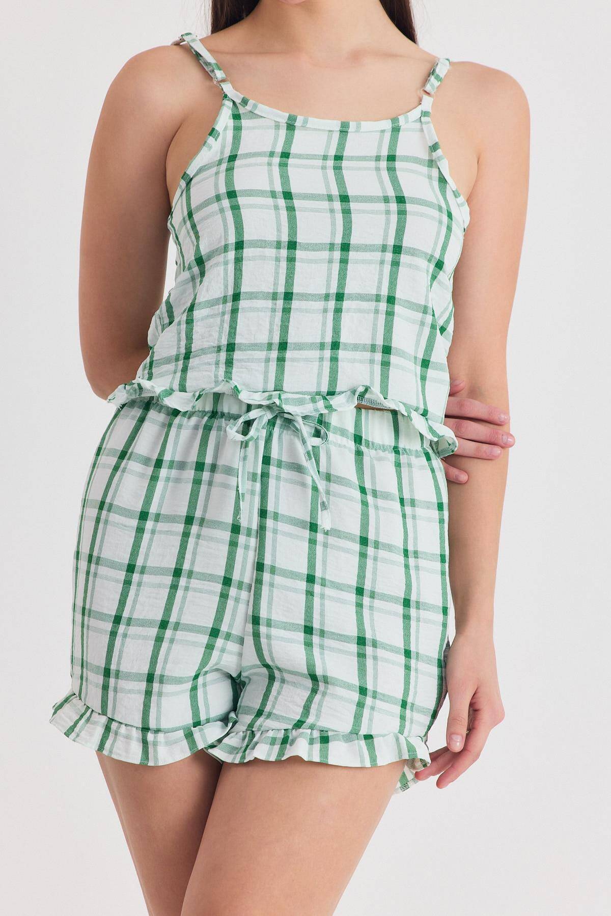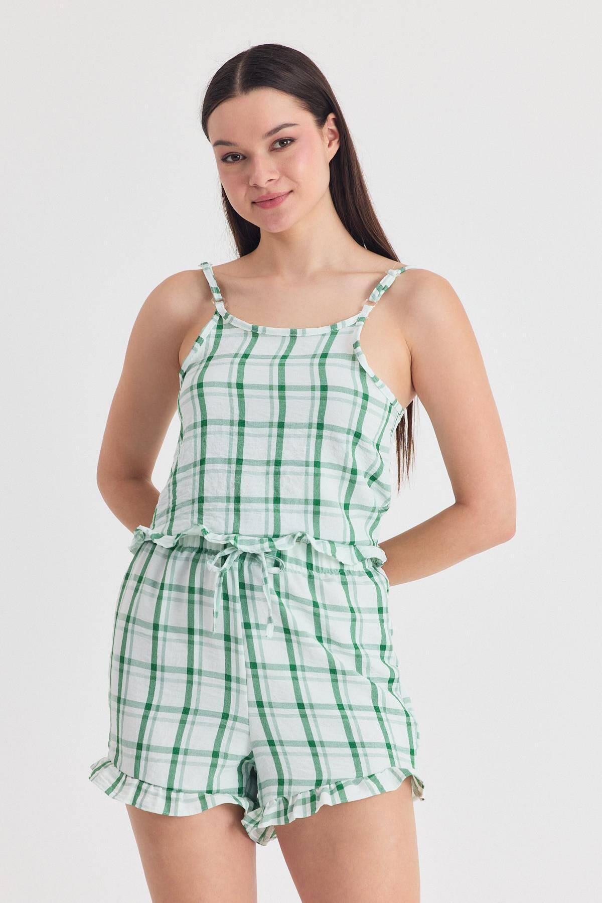 Yeşili Ekose Desenli Fırfır Detaylı Şortlu Takım 4452